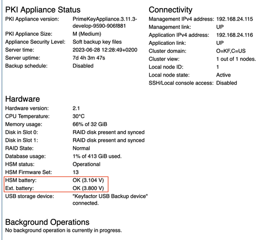 In the WebConf page Status > Overview page the state of the HSM battery and the external battery can be observed.