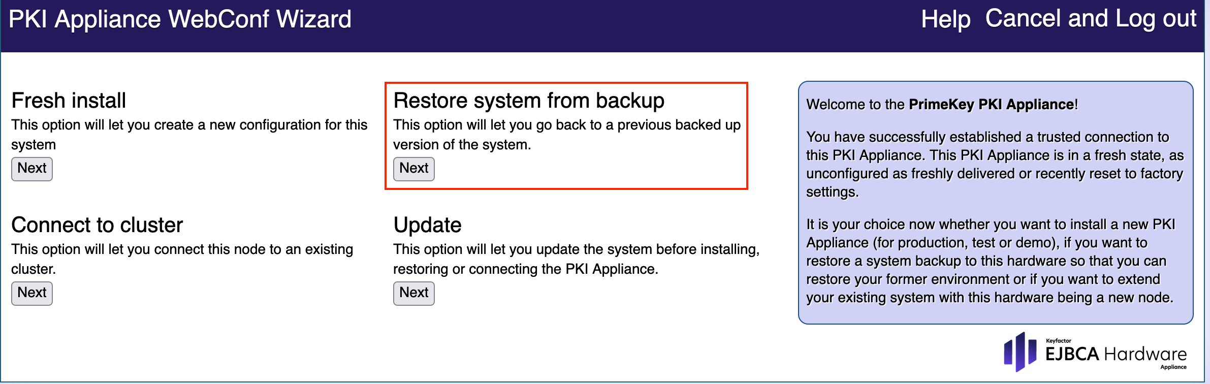 For more information refer to the section Migrating the HSM to certified FIPS (Federal Information Processing Standards) mode.Click Restore system using this backup to continue the usual Restore system from backup procedure. The actual migration is performed in the background.