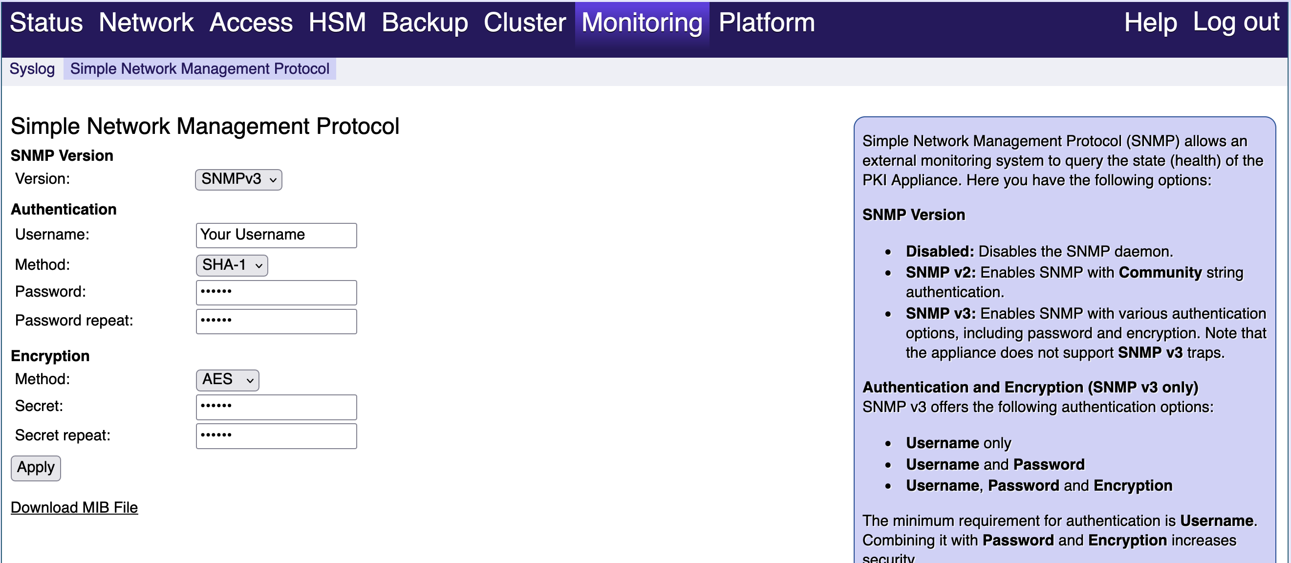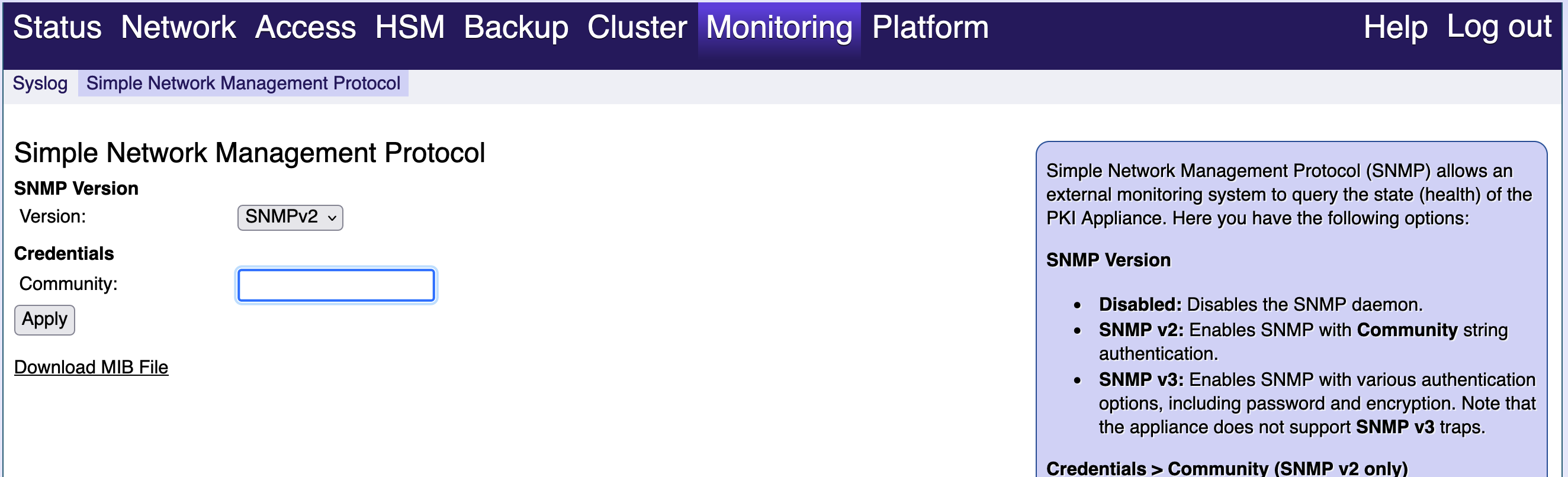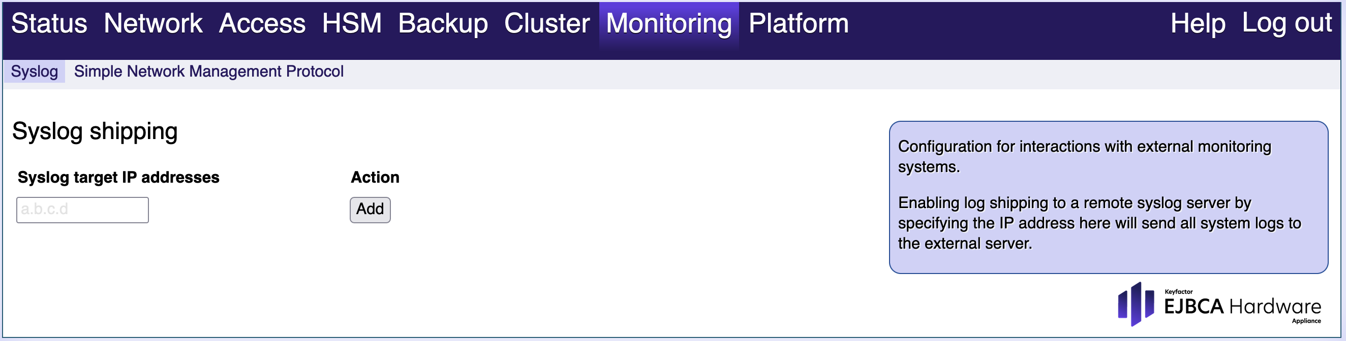Use this tab to configure interactions with external monitoring systems. Here you can specify a syslog server to which the syslog of Hardware Appliance should be sent. The syslog of the Hardware Appliance contains the syslog of all internal systems as well as the EJBCA audit log. The syslog will be shipped by UDP in unencrypted, unsigned traffic.