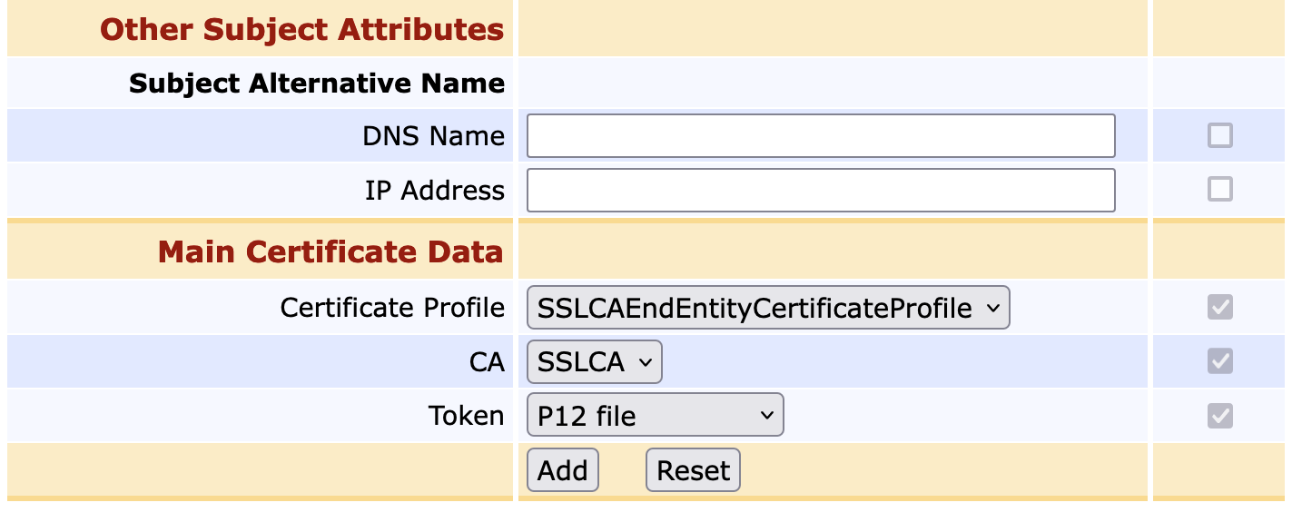 Main Certificate Data: - Certificate Profile: Select SSLCAEndEntityCertificateProfile