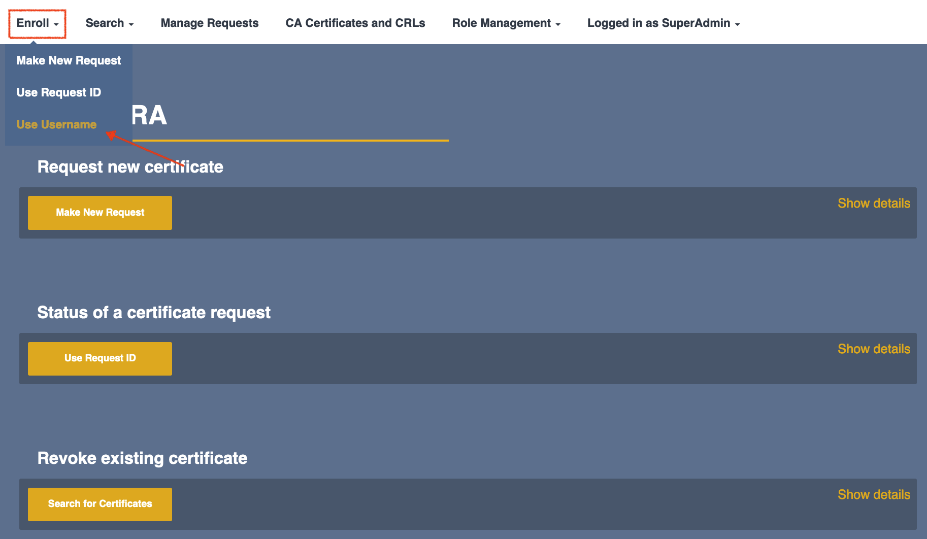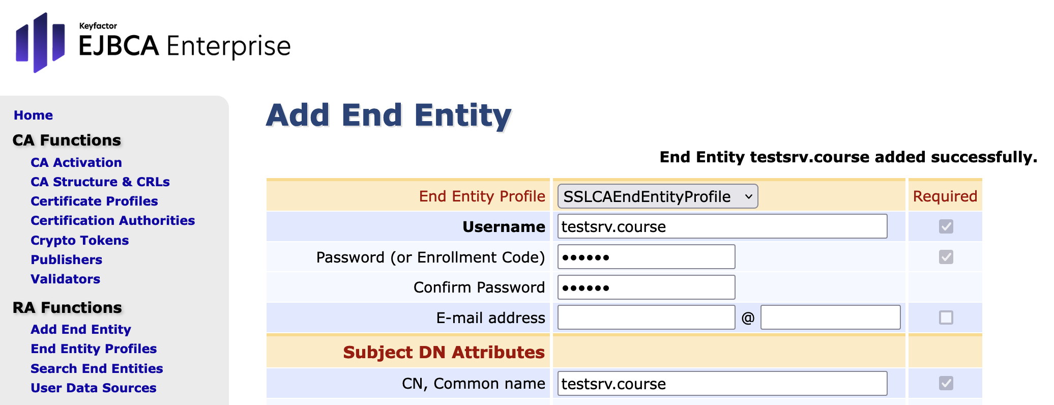 - In the sidebar, in the RA Functions section, select Add End Entity.