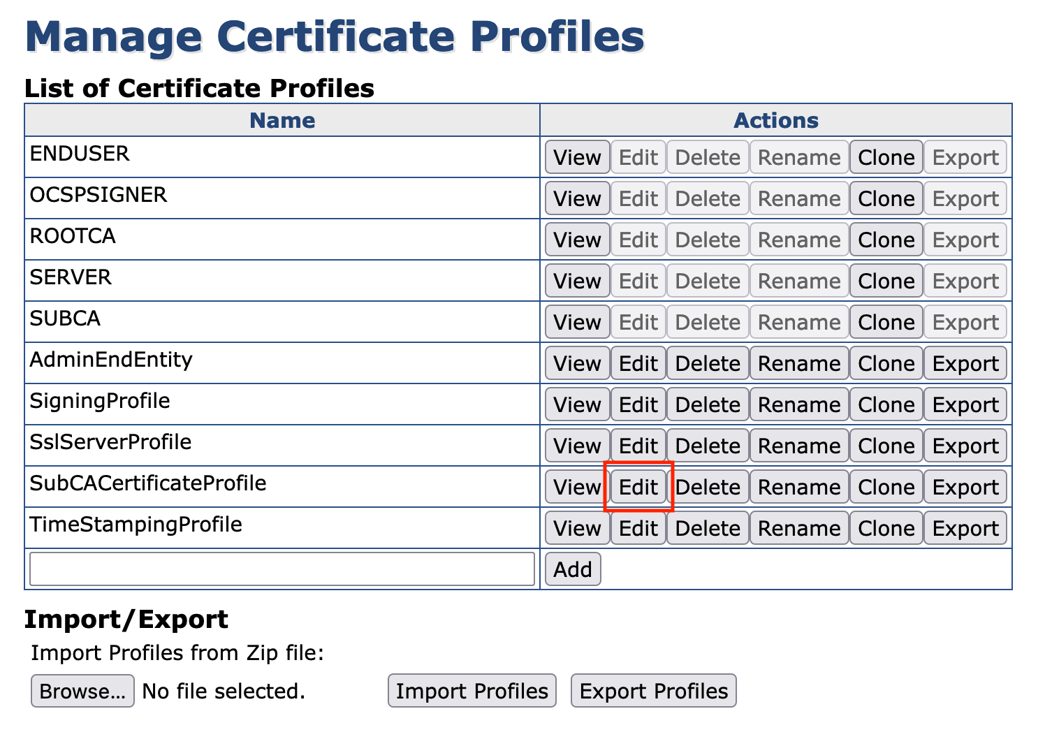 In the List of Certificate Profiles click Edit for SubCACertificateProfile: