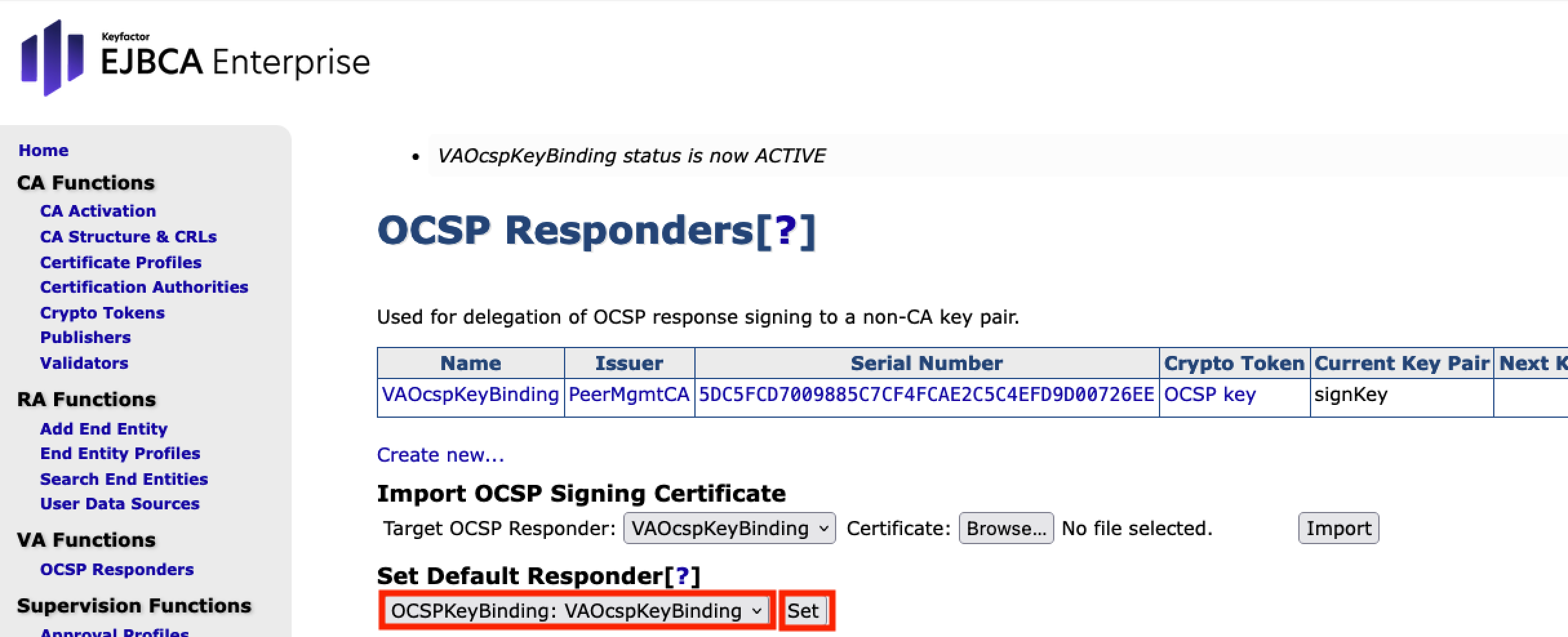 The key binding is created and the following message is displayed: VA OcspKeyBinding created with ID xxxxxxxxxx. (Depending on the database status, this ID could be set to any value.)