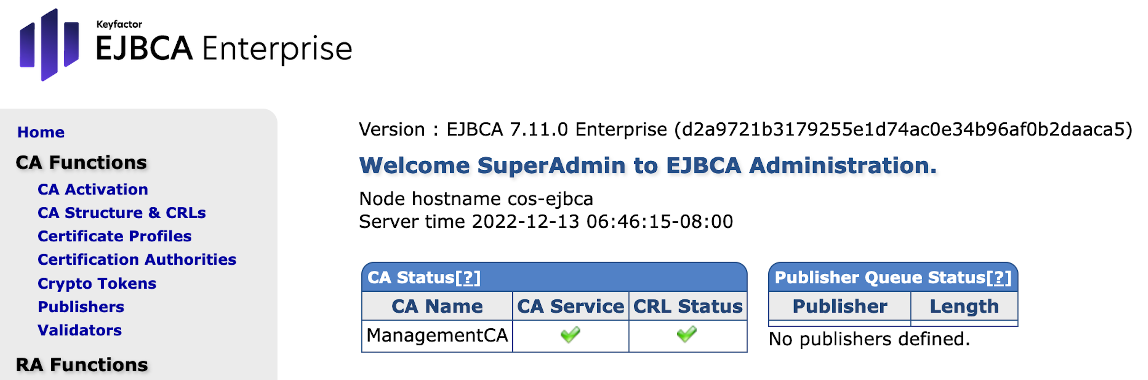 The EJBCA Administration page of the Hardware Appliance without ManagementCA looks as follows: