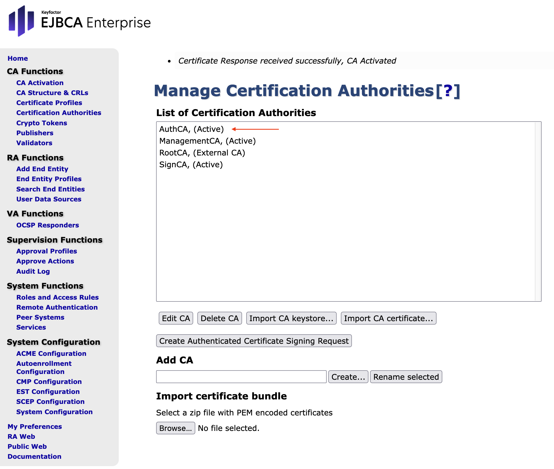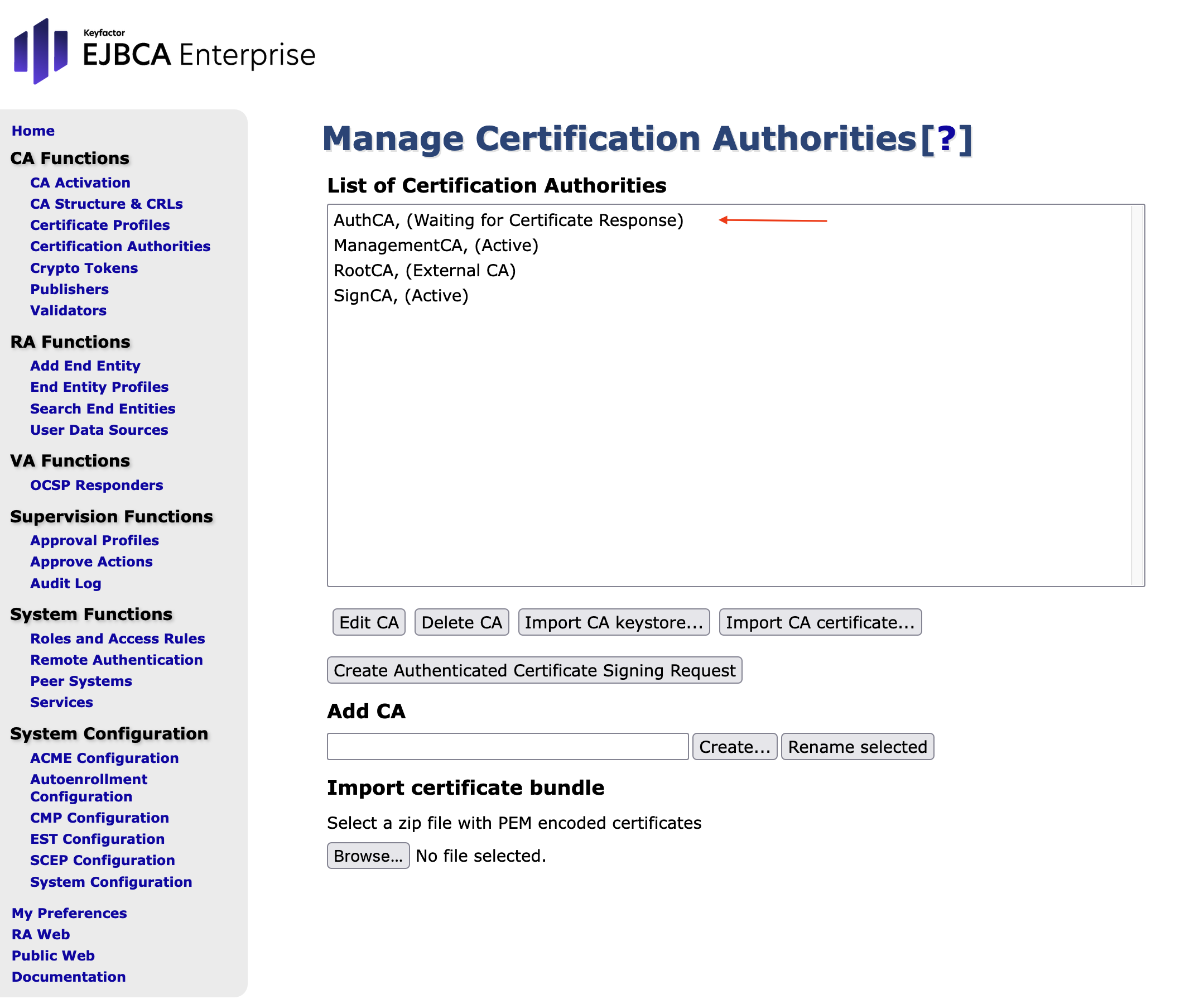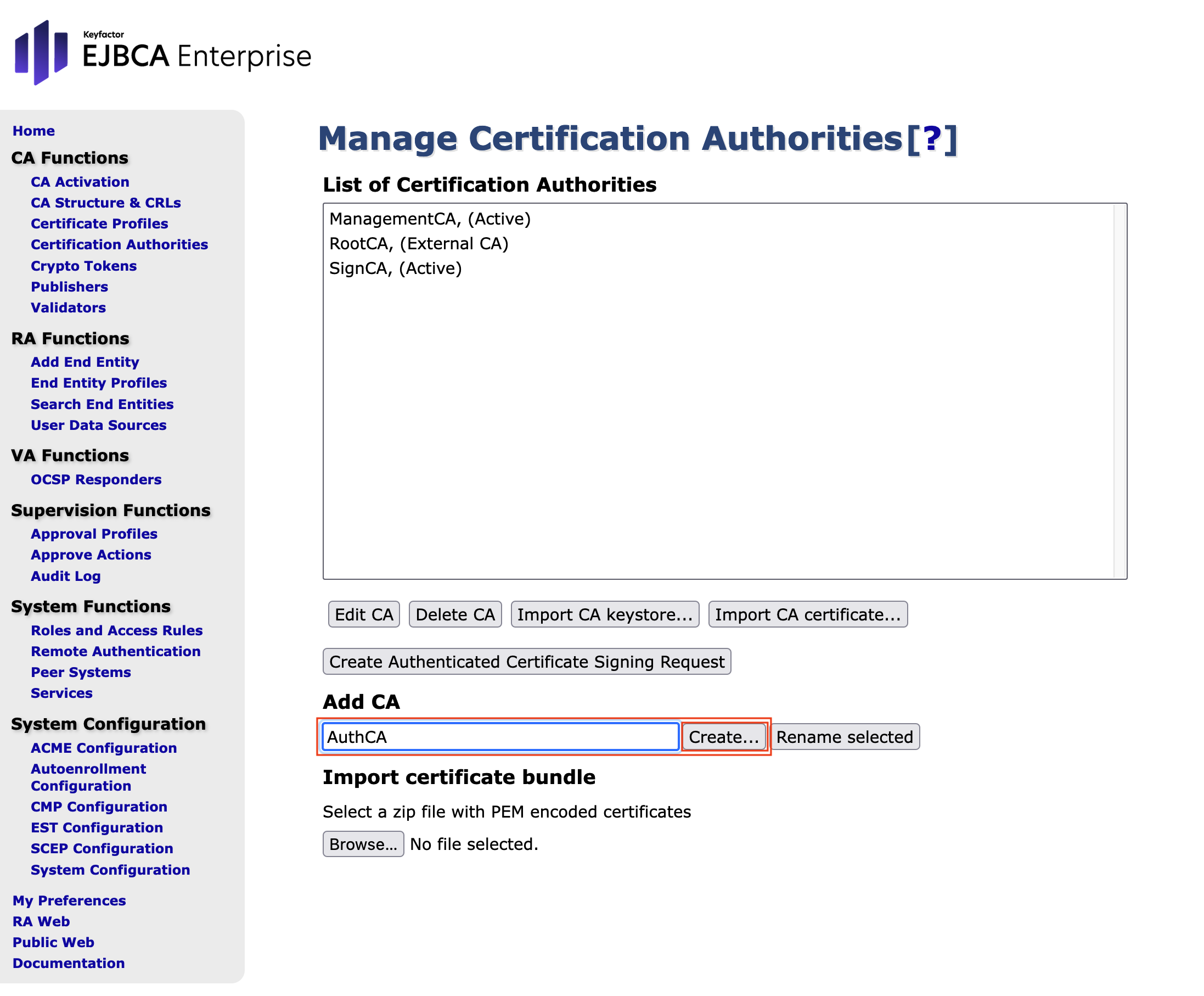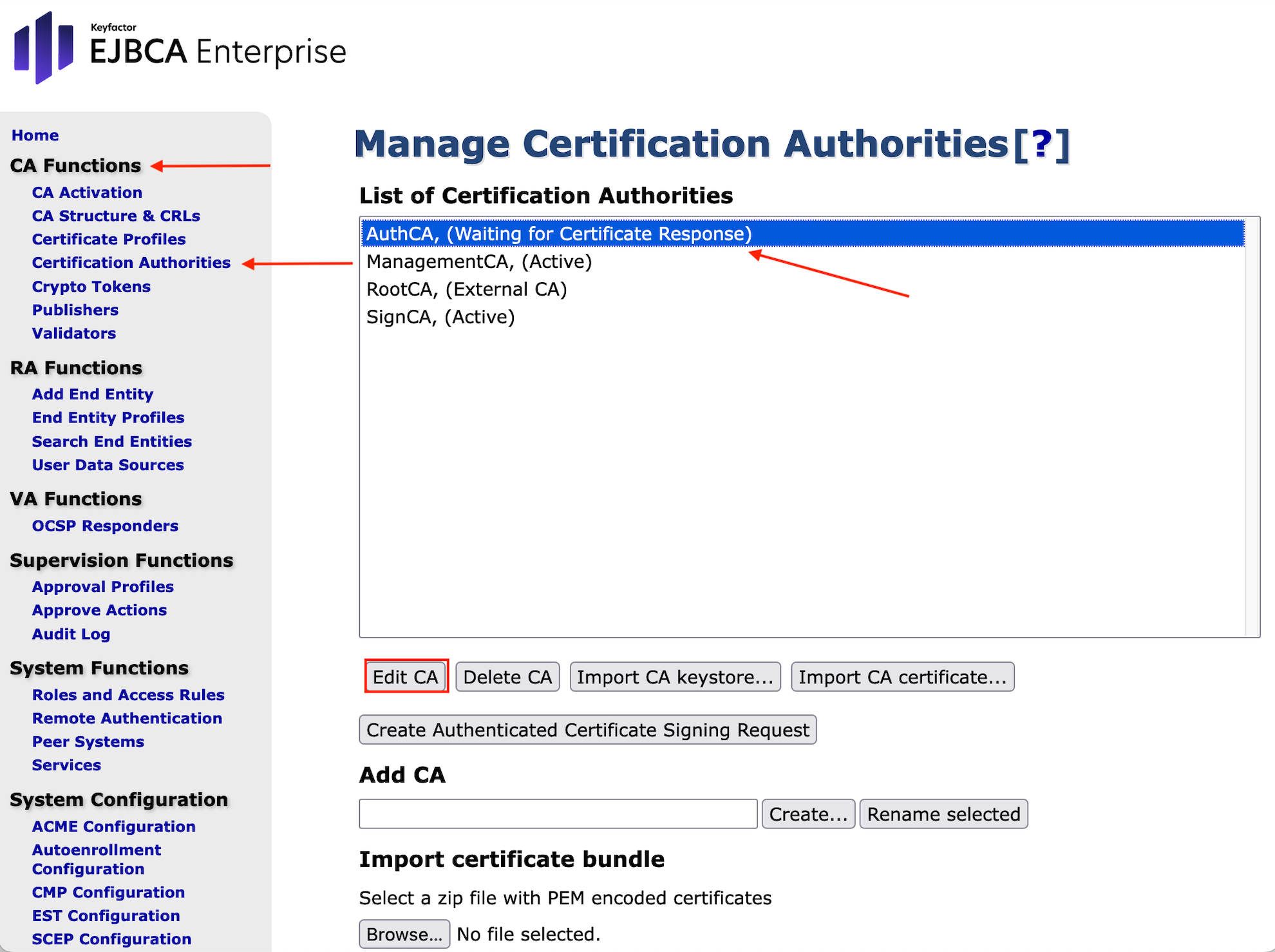 10. In the EJBCA Hardware Appliance where AuthCA is installed (Node A), go to the sidebar, in the CA Functions section and select Certification Authorities.