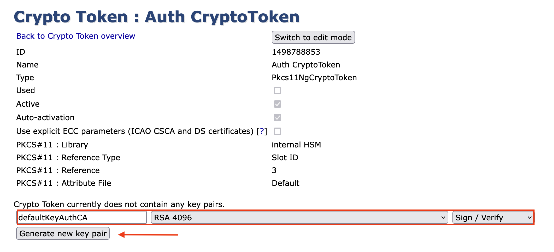 1. Underneath the table, enter defaultKeyAuthCA (value for Alias) and RSA 4096 (value for Key Algorithm and Key Specification) and click Generate new key pair.
