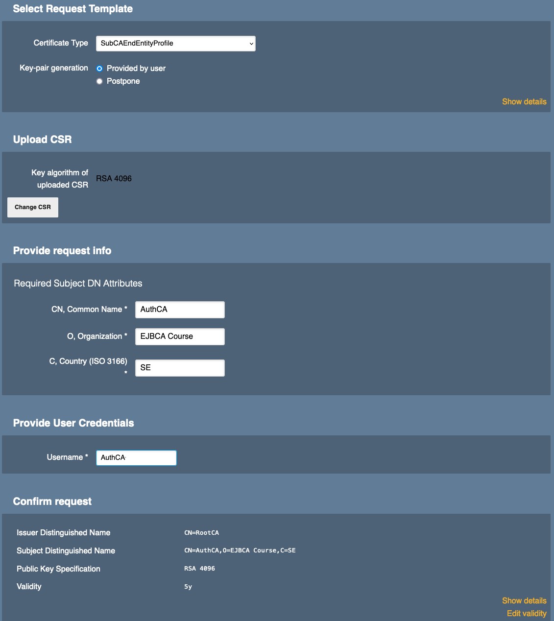 • Subject DN: Enter CN=AuthCA,O=EJBCA Course,C=SE