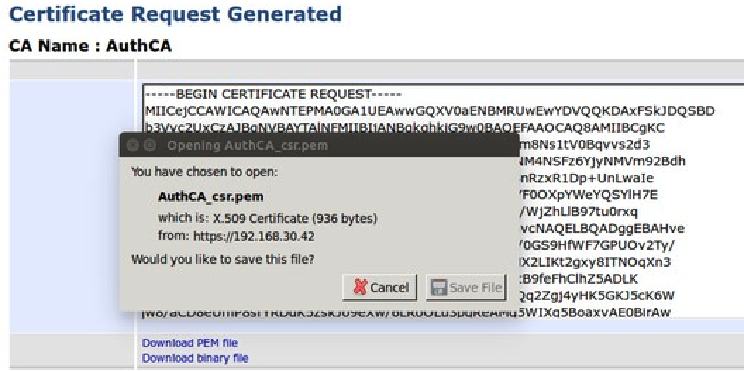 8. You will be asked to download or copy the request. Save the .csr file with Save File: