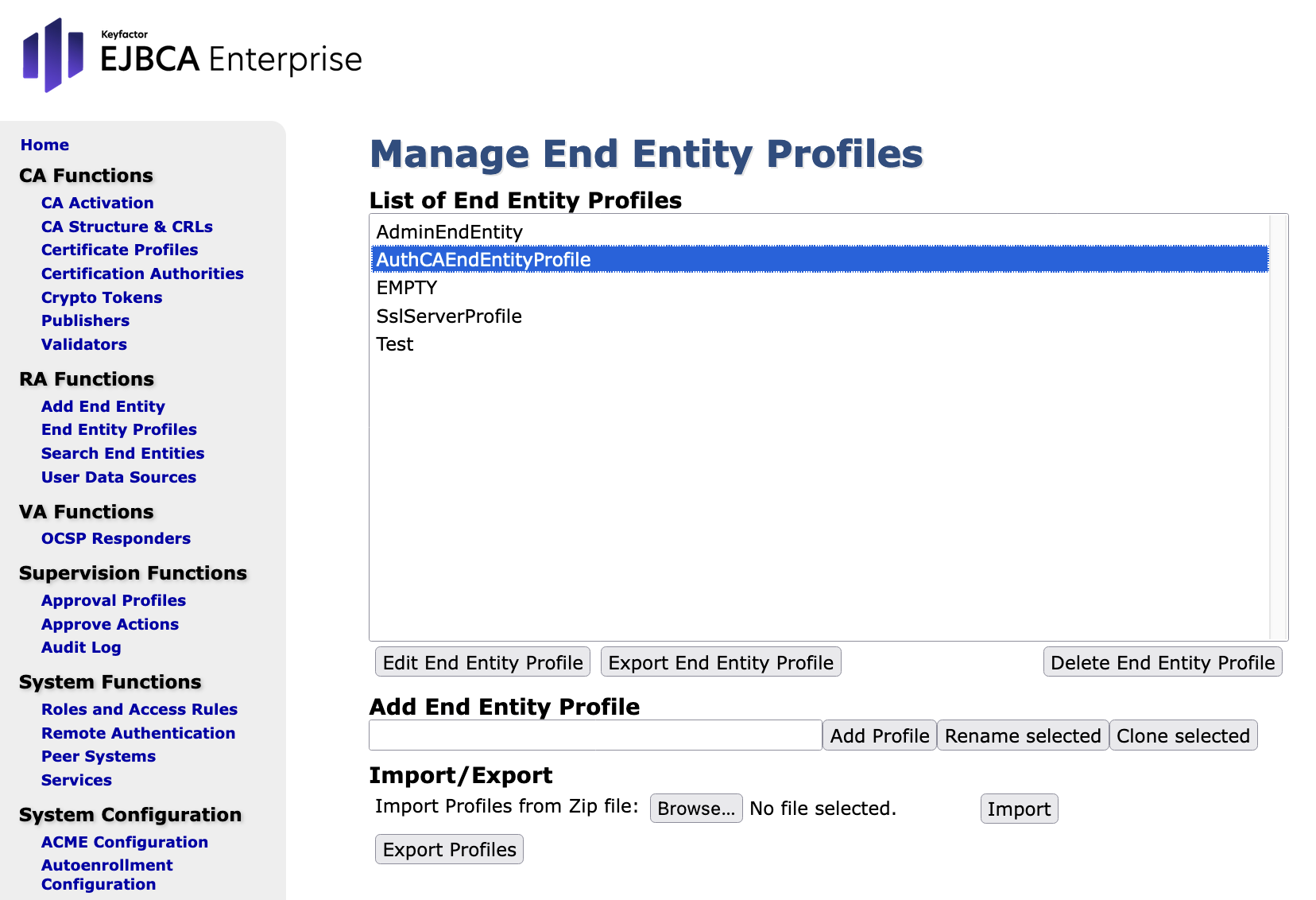 - In the list List of End Entity Profiles select AuthCAEndEntityProfile.