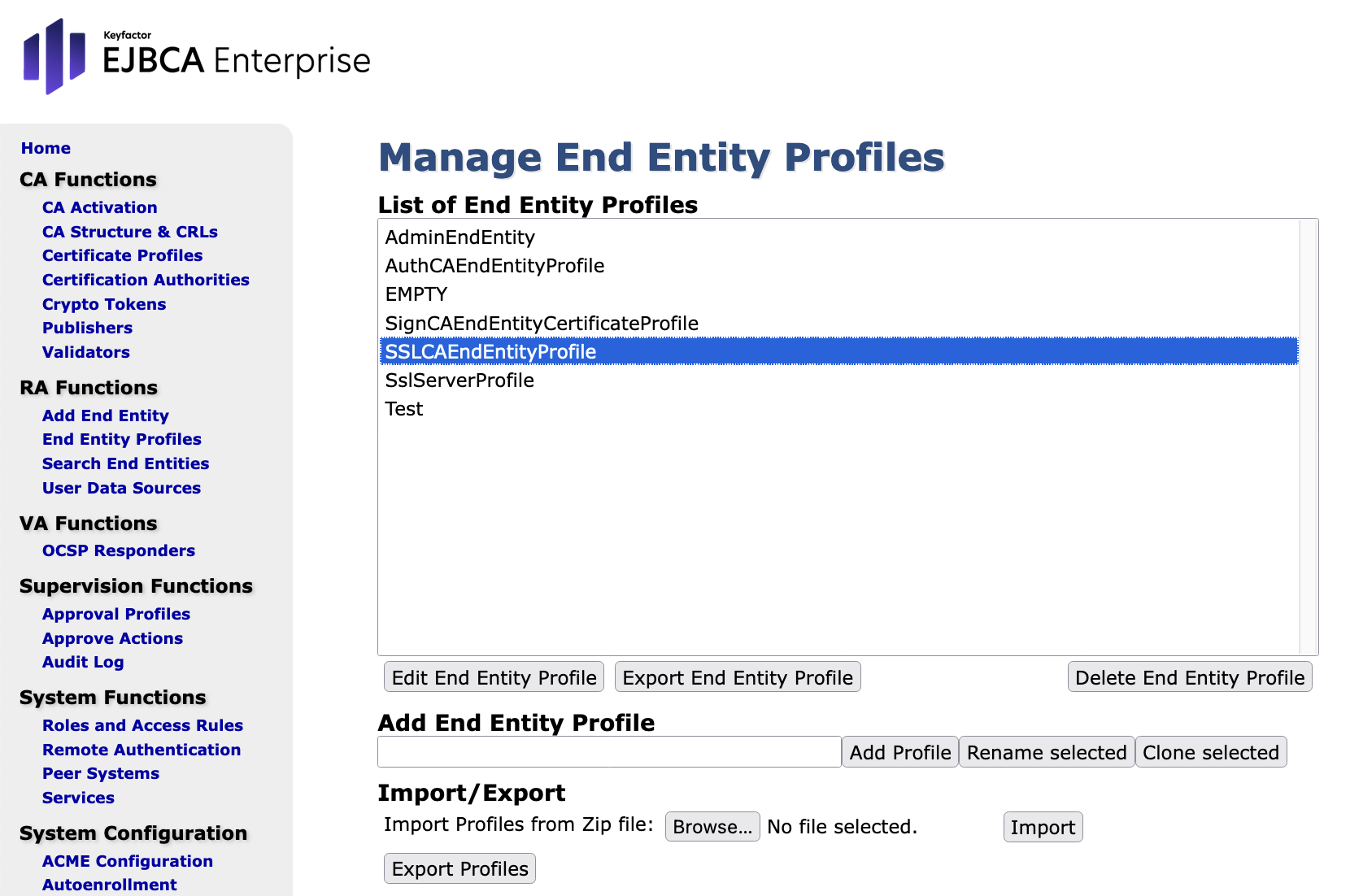 Select SSLCAEndEntityProfile from the list List of End Entity Profiles and click Edit End Entity Profile: