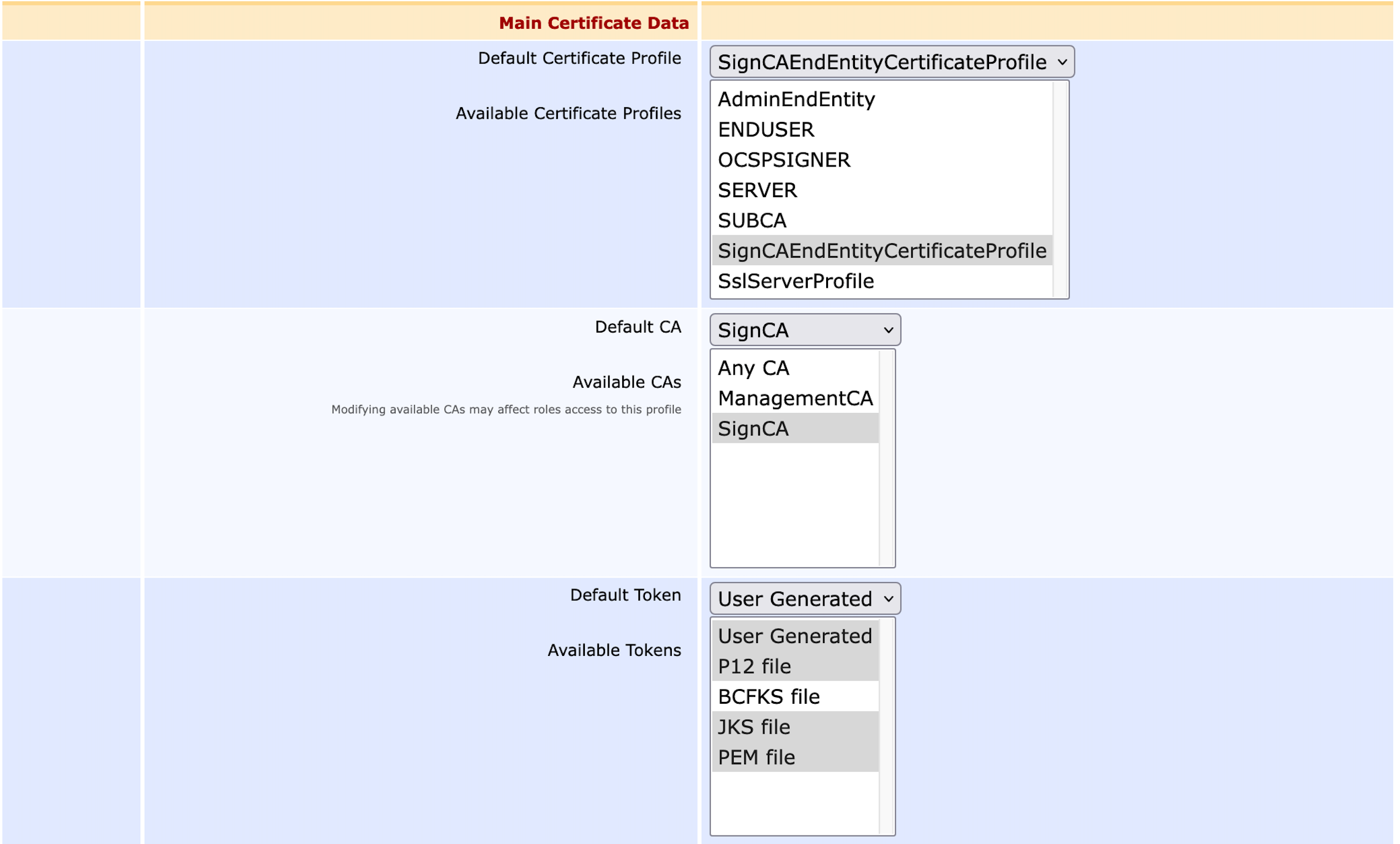 - Available Certificate Profile: Select SignCAEndEntityCertificateProfile