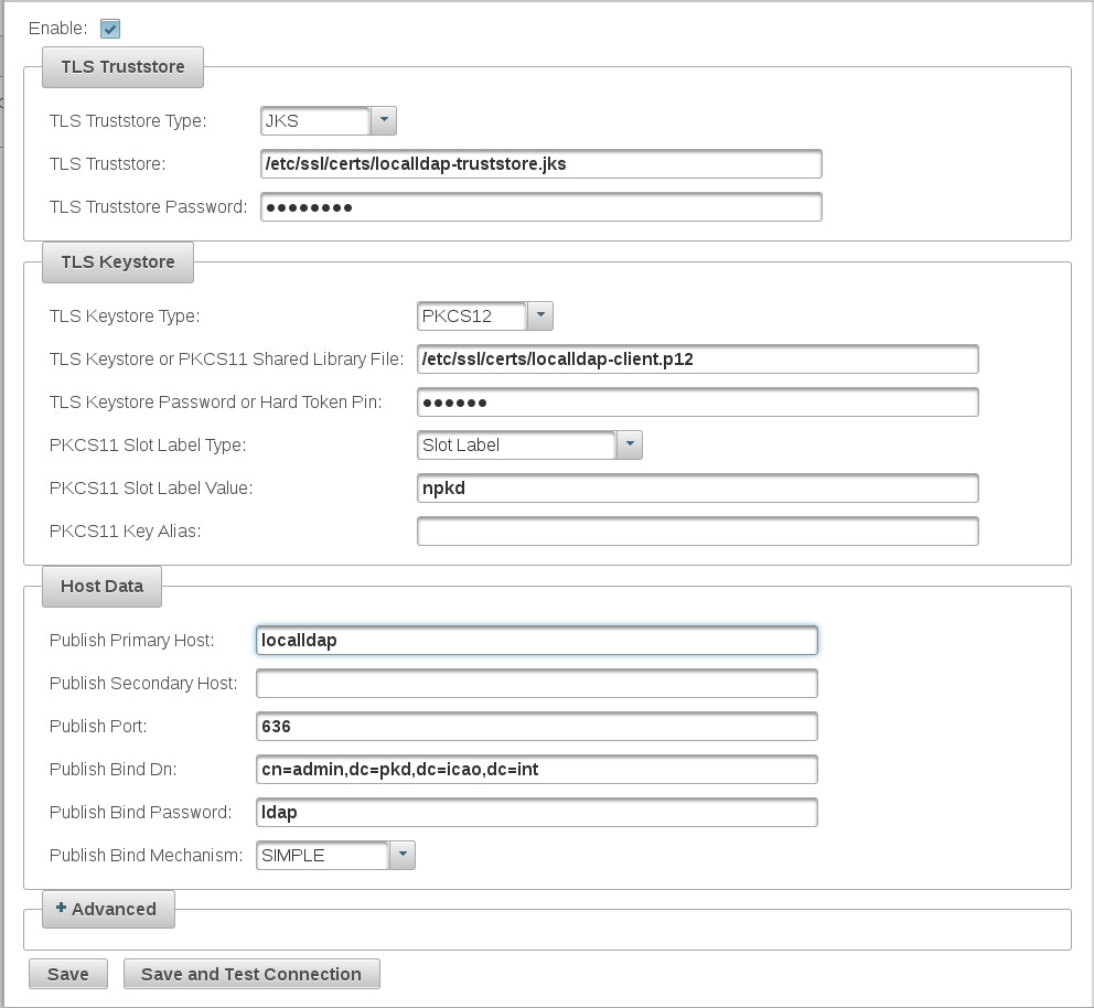 - Enable Local LDAP: If checked, Local LDAP is enabled and will be used during all (un)publishing and sync operations. Otherwise, it will be ignored alongside the configuration options below.