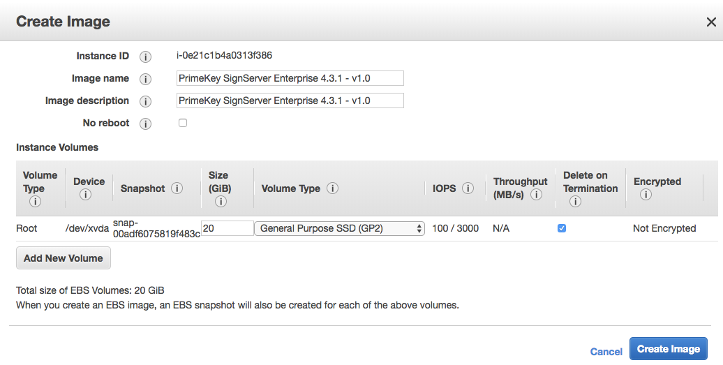 To backup an instance of SignServer Cloud, you can either use the CLI script included on the instance or create a snapshot in the AWS Console. This section describes how to backup using AWS snapshot. For information on how to backup via script, see Backup via CLI Script.