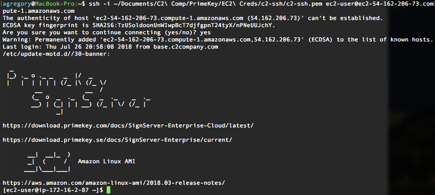 Using the SSH key that you selected when procuring the instance, SSH into the SignServer Cloud instance using the username ec2-user: