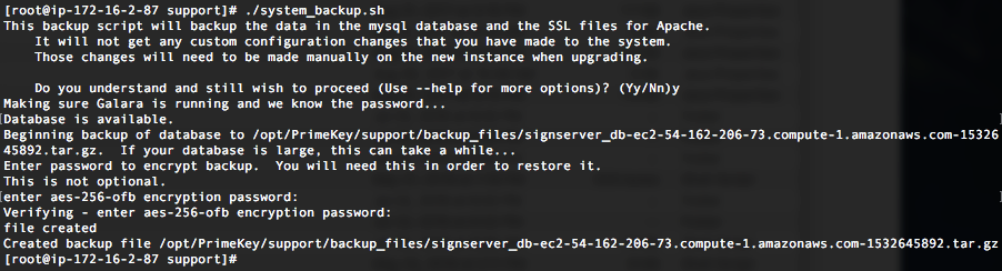 is copied to/home/ec2-user/:CODE# cp /opt/PrimeKey/support/backup_files/signserver_db-ec2-54-162-206-73.compute-1.amazonaws.com-1532645892.tar.gz /home/ec2-user/It is recommended to copy this backup to another system, either locally from your administration workstation, or in another AWS data center. For more information on how to copy the file from the SignServer Cloud instance, see the Copying Backup Files to Other Systems section.