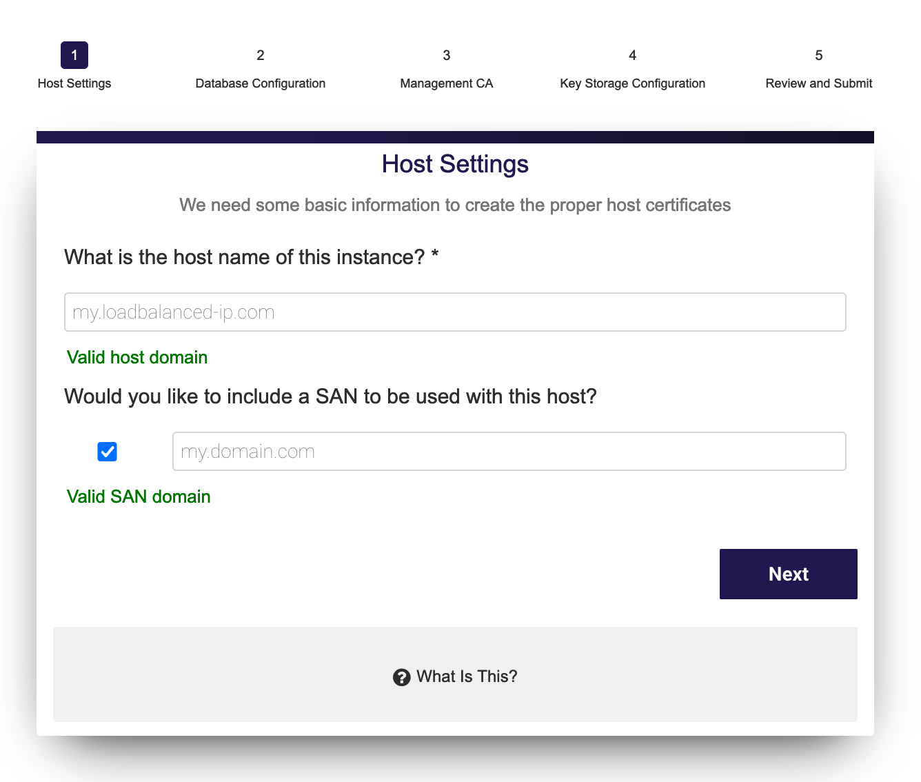 - Using a Subject Alternative Name (SAN) with this host can be done so that a public URL can be used to access SignServer. For example, if you would like to use https://pki.company.com/ to access a cluster of hosts, you can enter that DNS name into the wizard to be added as a SAN in the instance's TLS certificate. To use this feature, select the option to specify a Valid domain name. Note that the wizard will not verify that the domain name is a valid domain, but will confirm that the syntax is a recognized domain format.