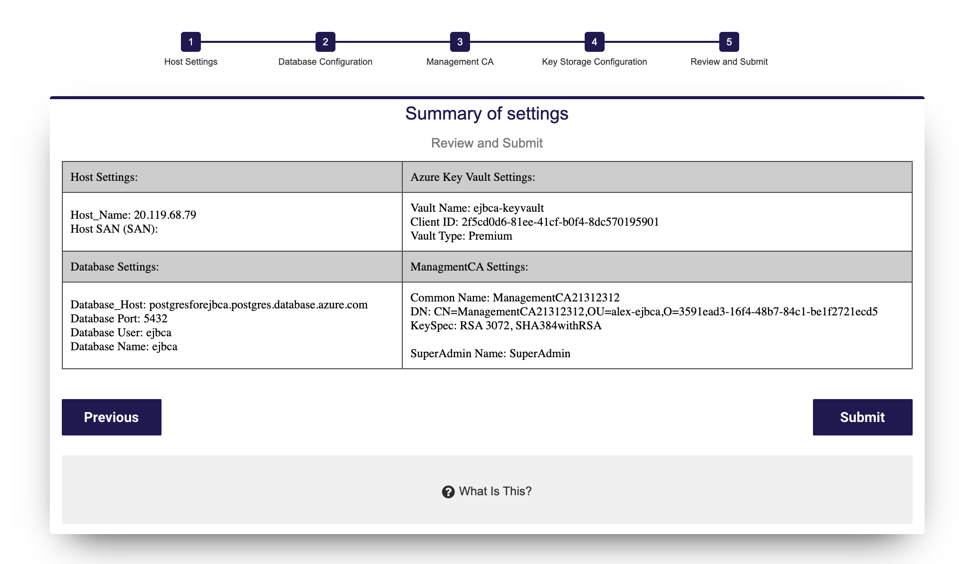 To set up your own HSM later, skip this step and click Next to continue to the Review and Submit page to review a summary of all settings.