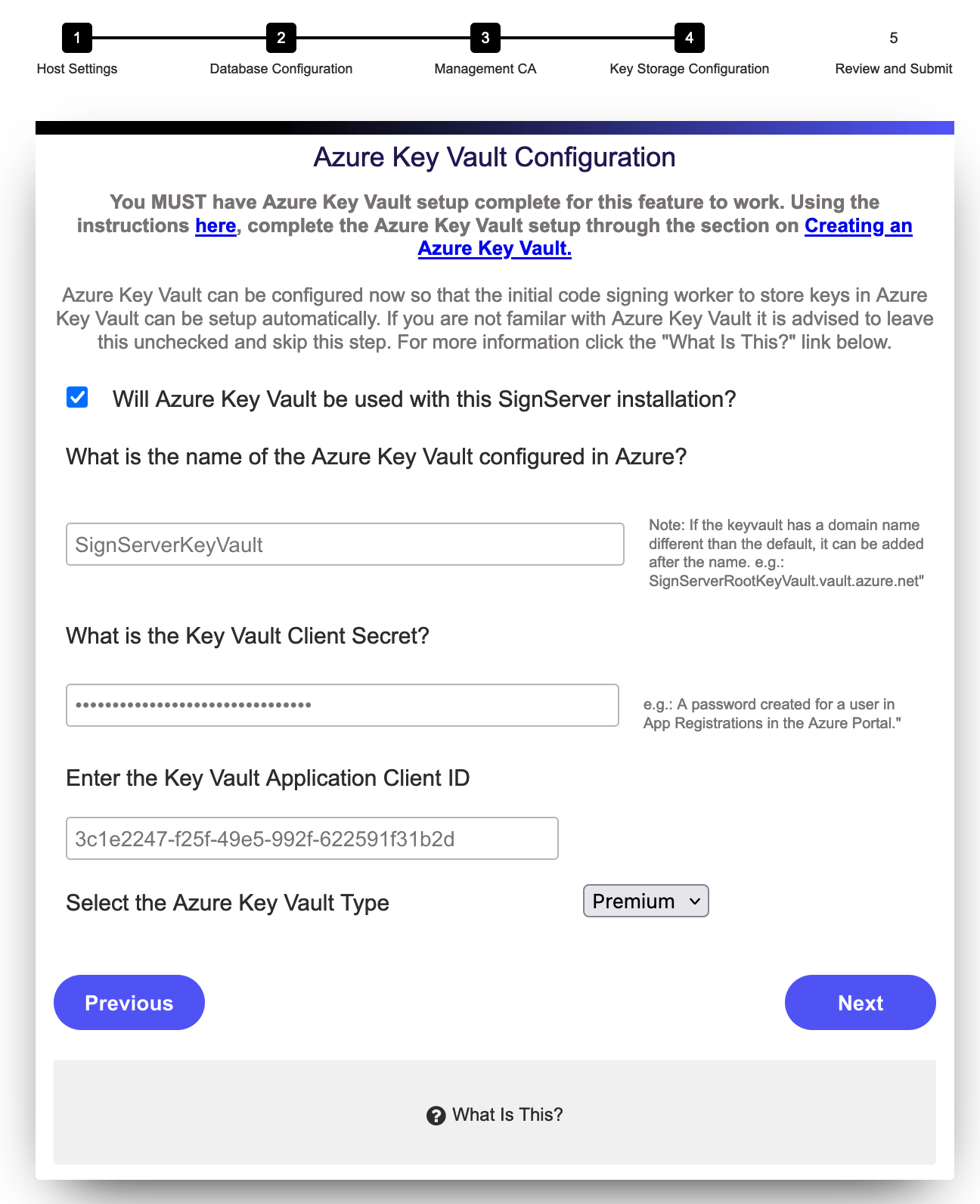 The Azure Key Vault Configuration settings are not relevant if you have selected to Use Existing ManagementCA since this means that no CA keys will be created.