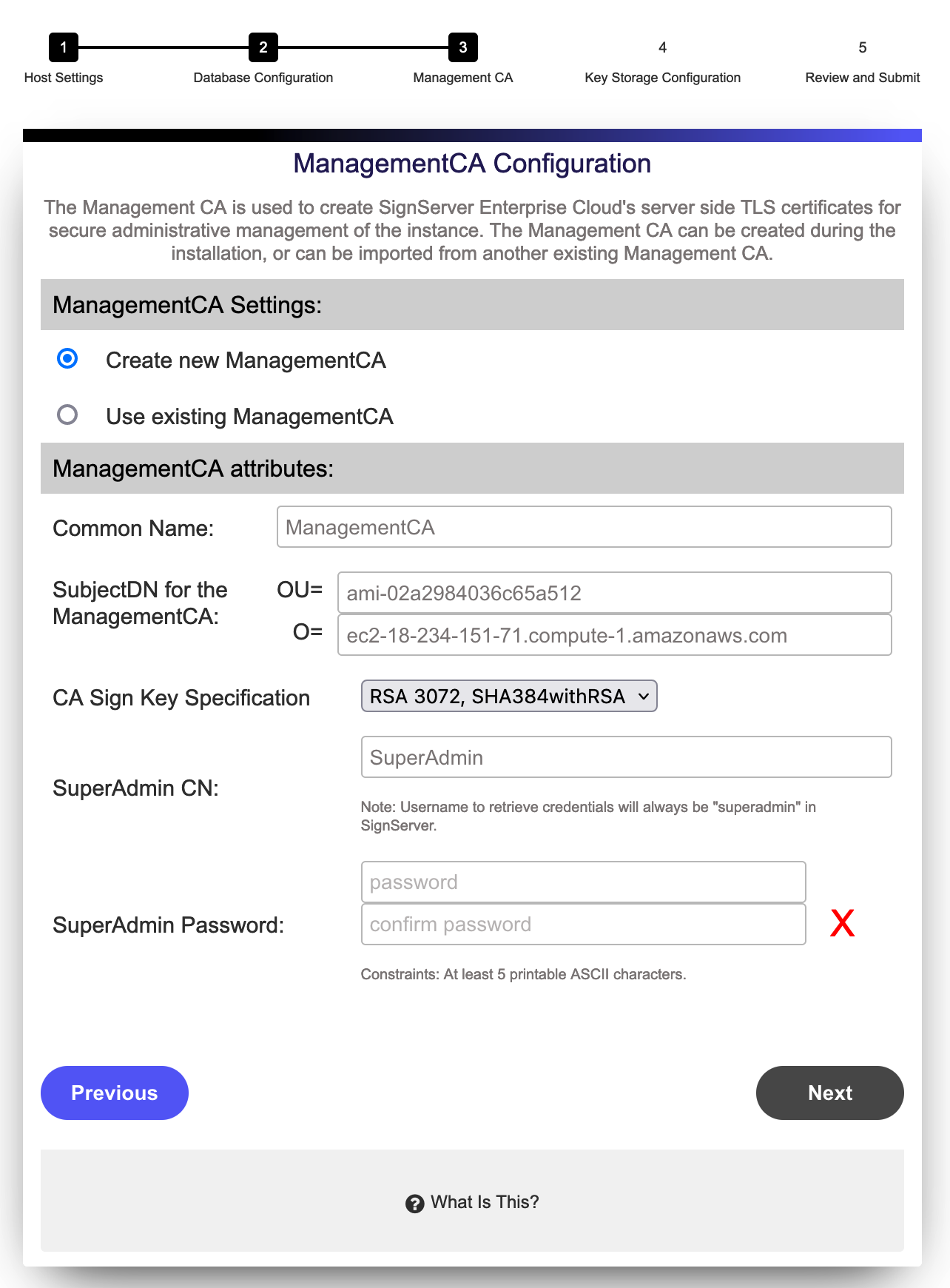 SignServer will create a Management CA based on attributes of the system to guarantee uniqueness. You can optionally import an existing ManagementCA to the instance and have certificates from that CA be allowed access to this installation, see Use Existing (Import) ManagementCA.