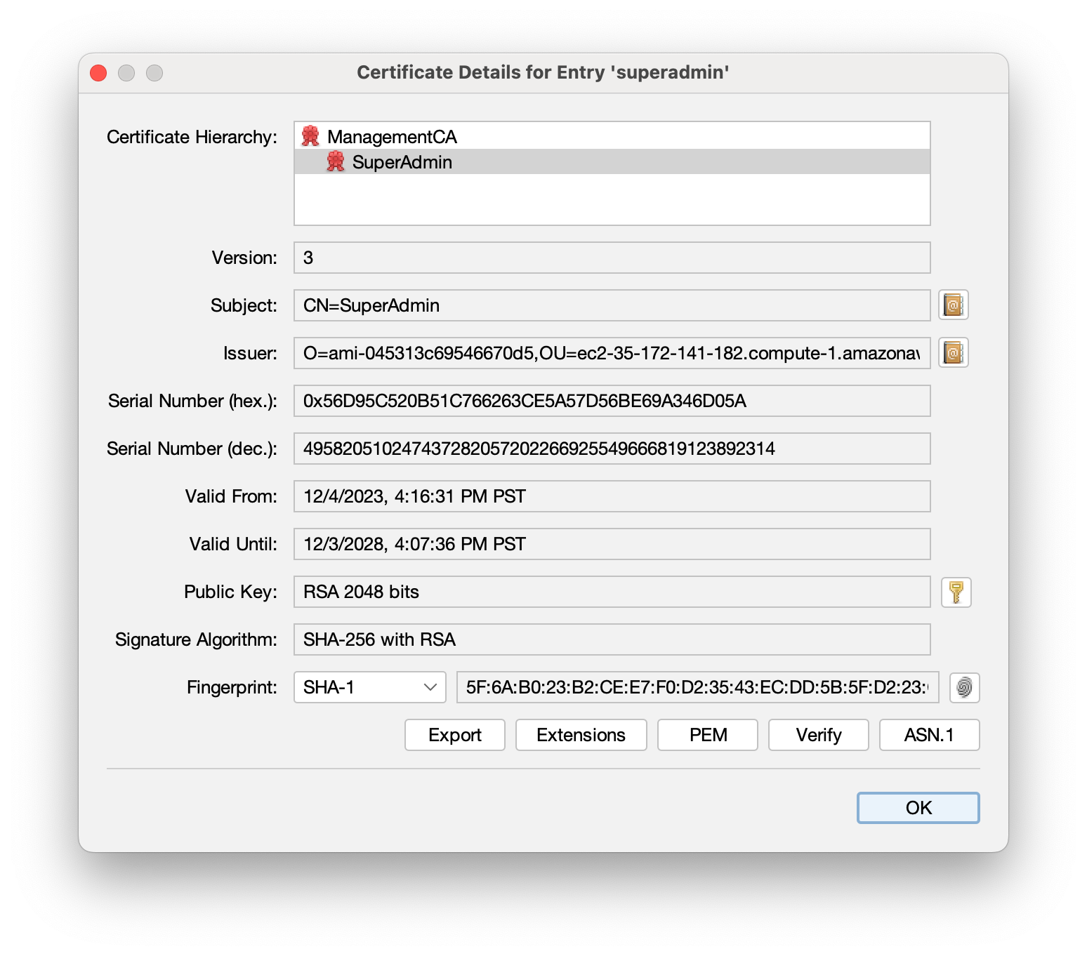 Subject fields | OU= and O= can be configured for the ManagentCA DN. Includes the ReservationID, AMI-ID of the instance by default. Certificates are listed in the browser store by "O=". |
