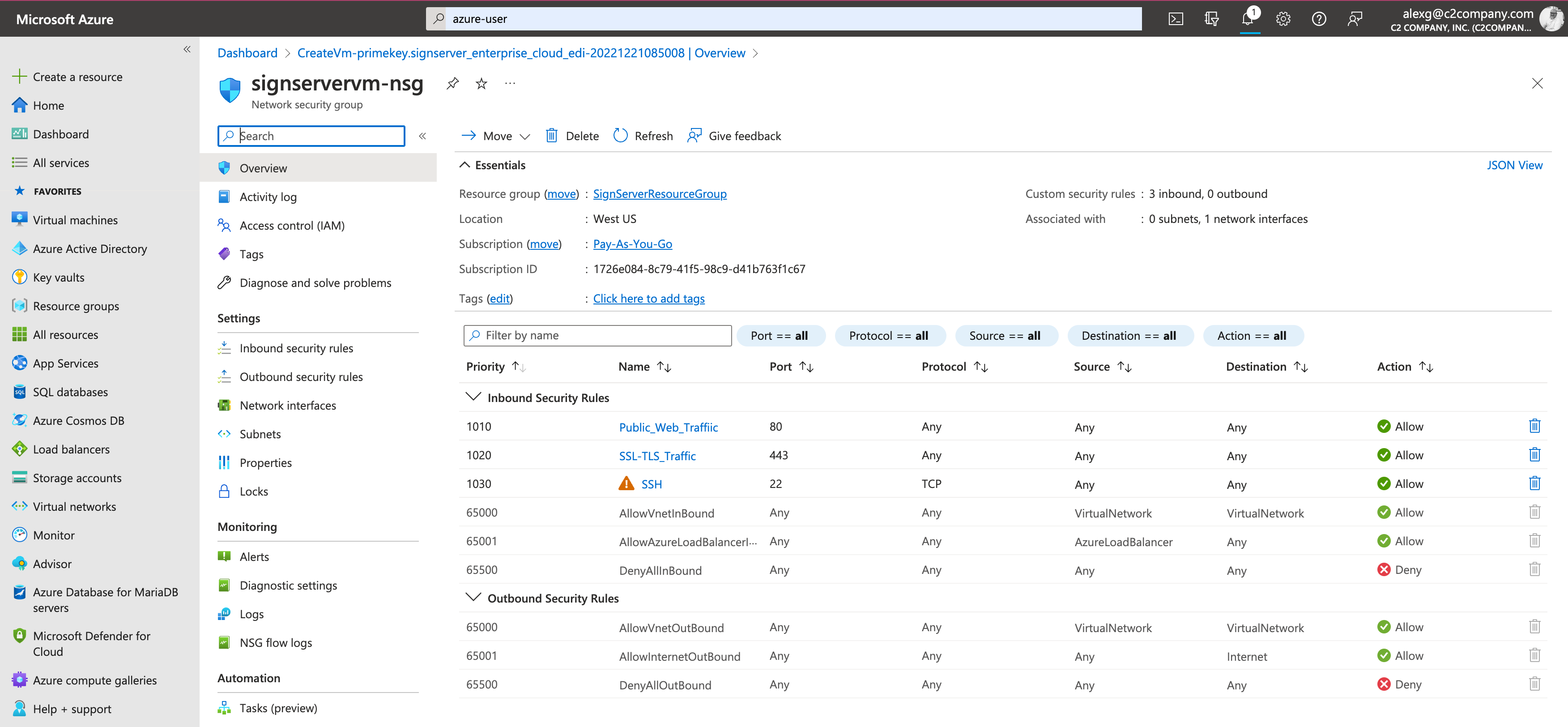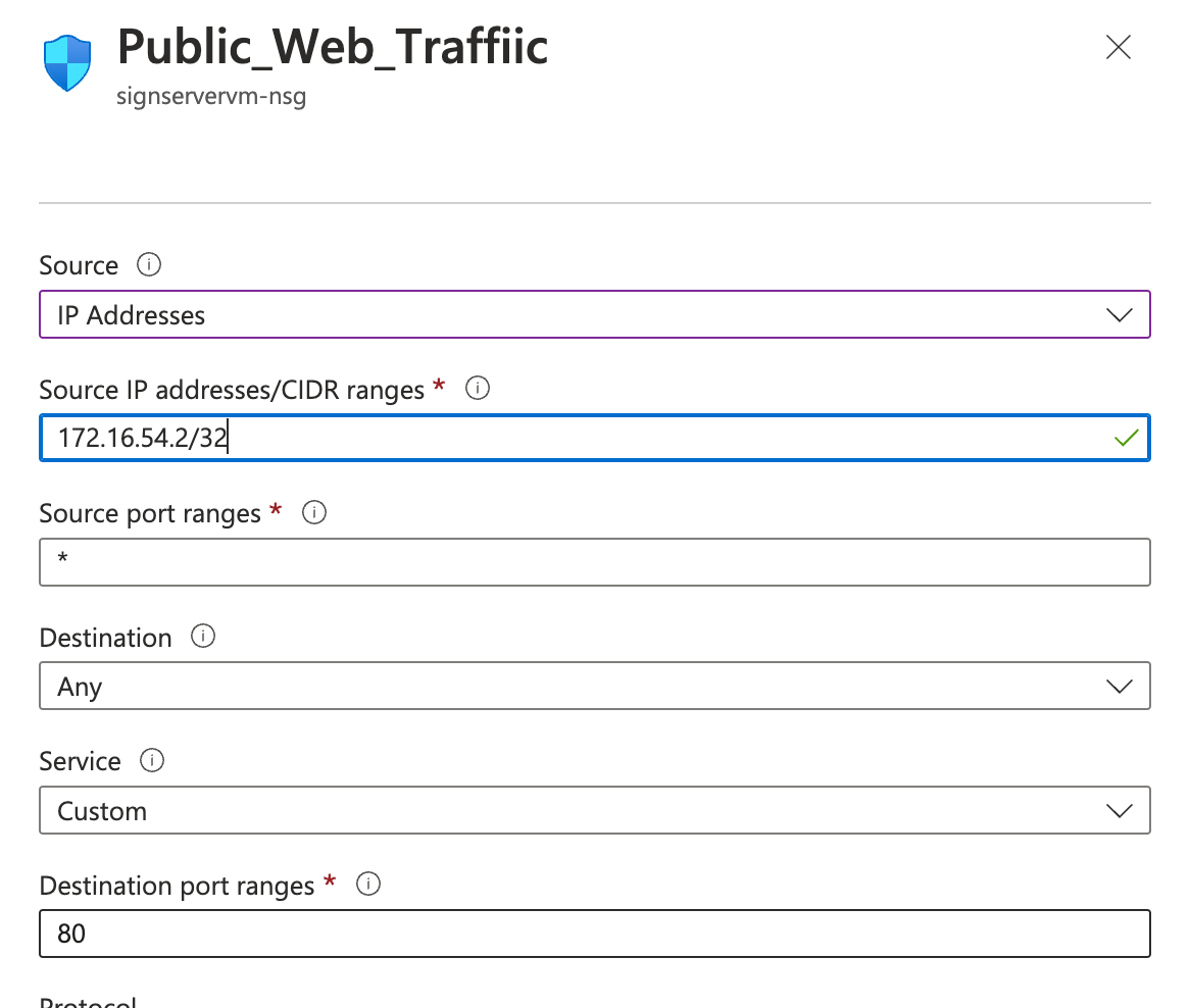 - There will be three Network Security Rules that can be edited if you would like to not have your SignServer instance be on the internet, Public_Web_Traffic, SSL-TLS Traffic and SSH.