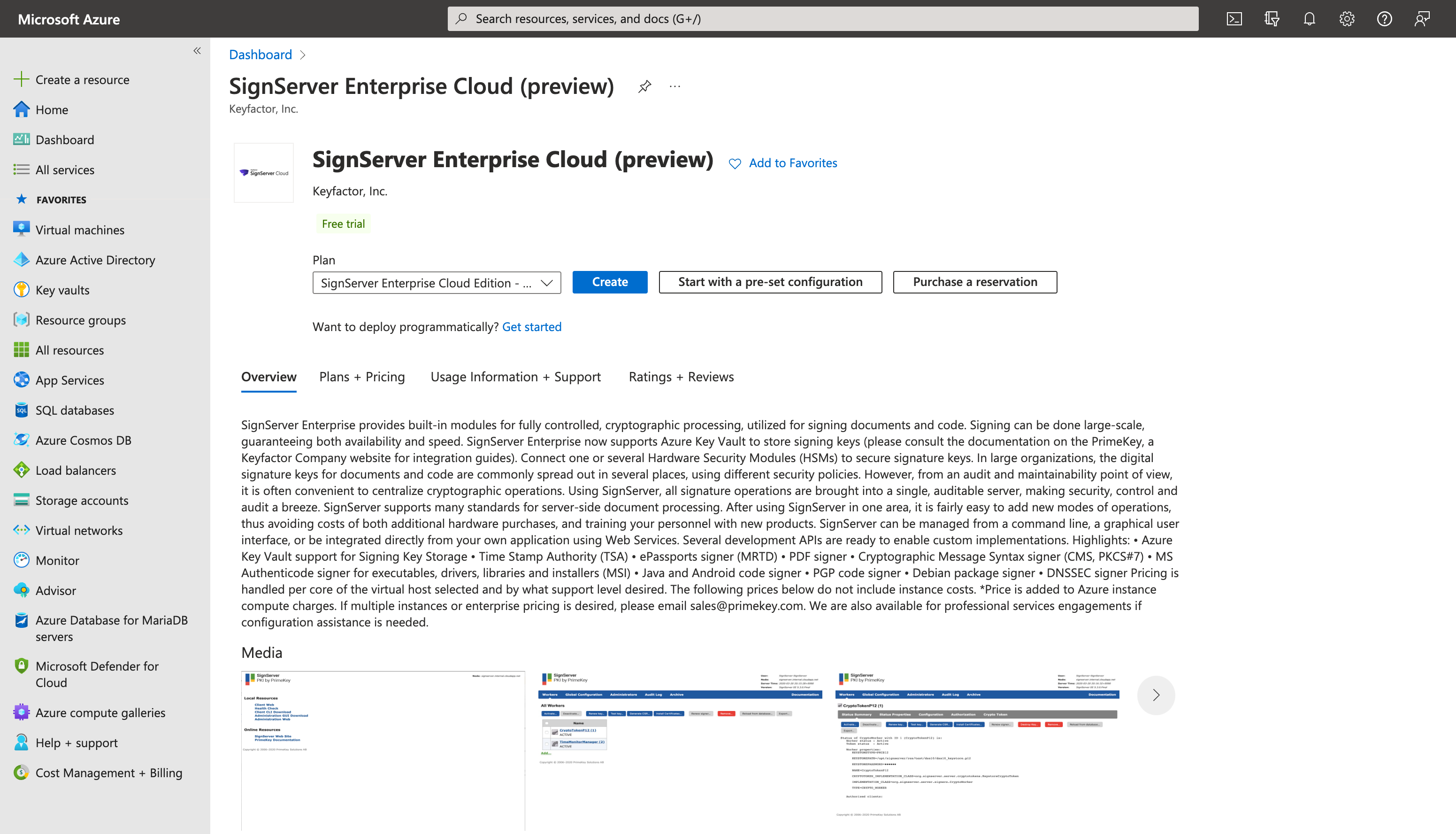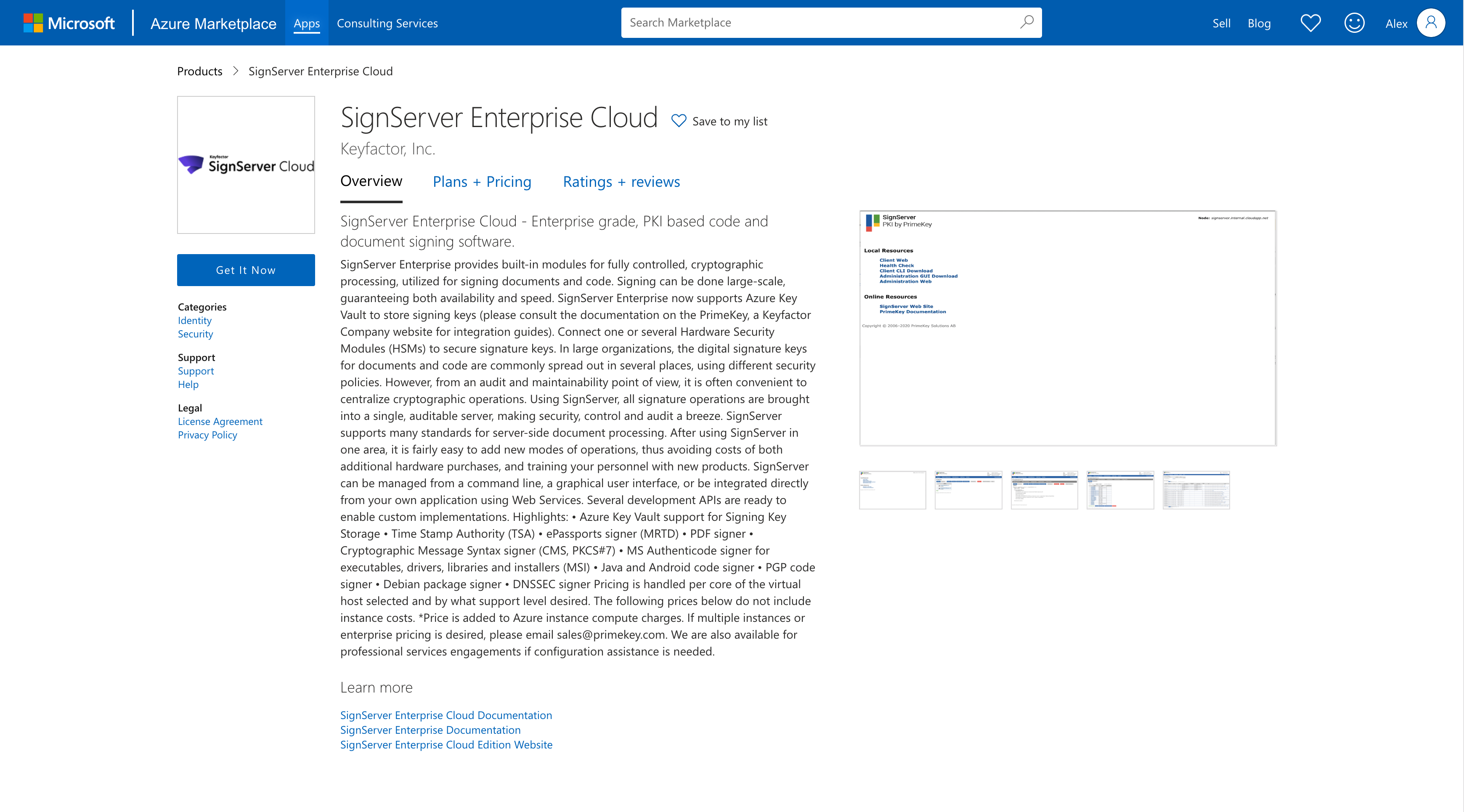 - Browse to the Azure Marketplace and search for "primekey" to display the SignServer Cloud.