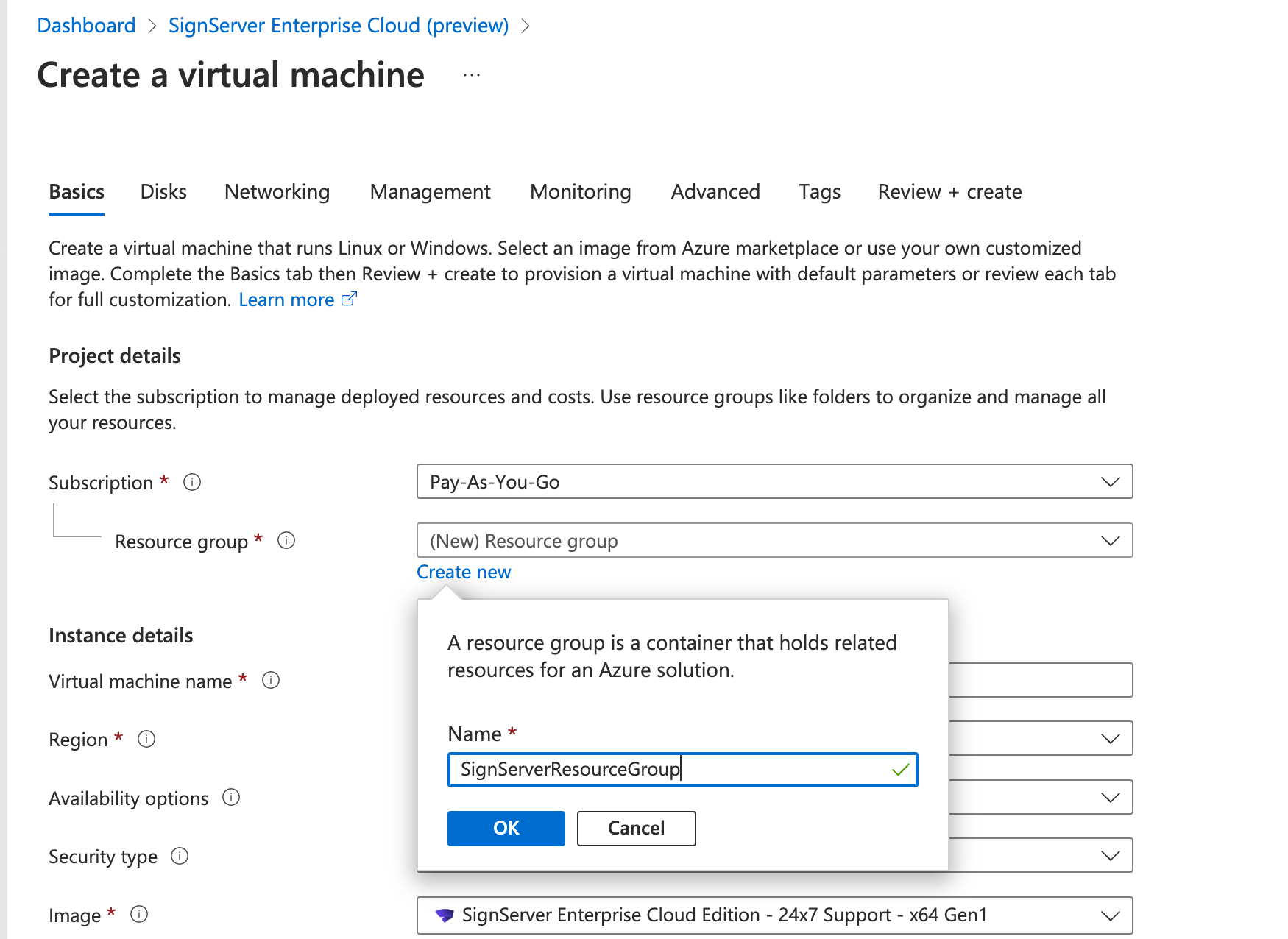 - Select the desired subscription, click Create new and enter the name of a Resource Group that will hold all of the SignServer Cloud resources, and then click OK.