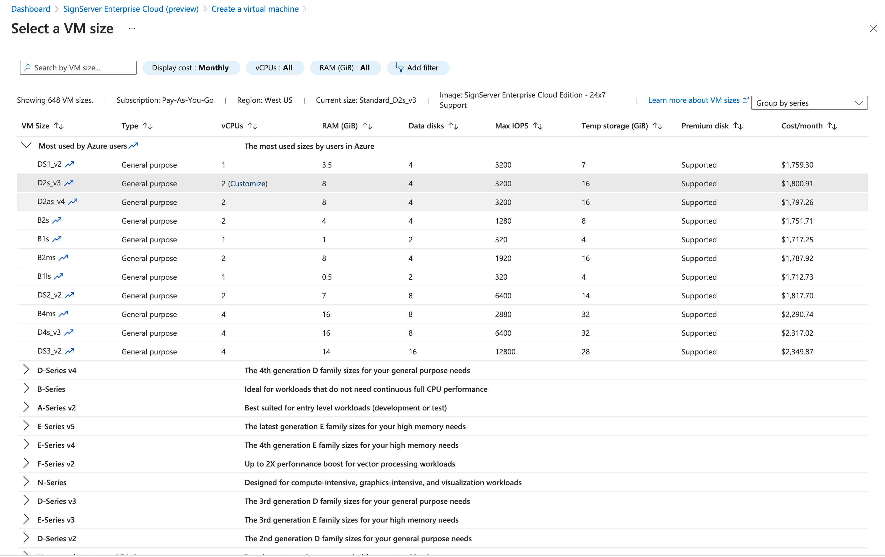 - For the VM Size, select one from the instance sizes shown. Please do not select a instance size of less than 2 Cores. SignServer is a multi threaded app and requires at least 2 Cores. It will calculate the available memory on the host and automatically configure SignServer to have a portion of it. Select see all sizes to check all available instance types.