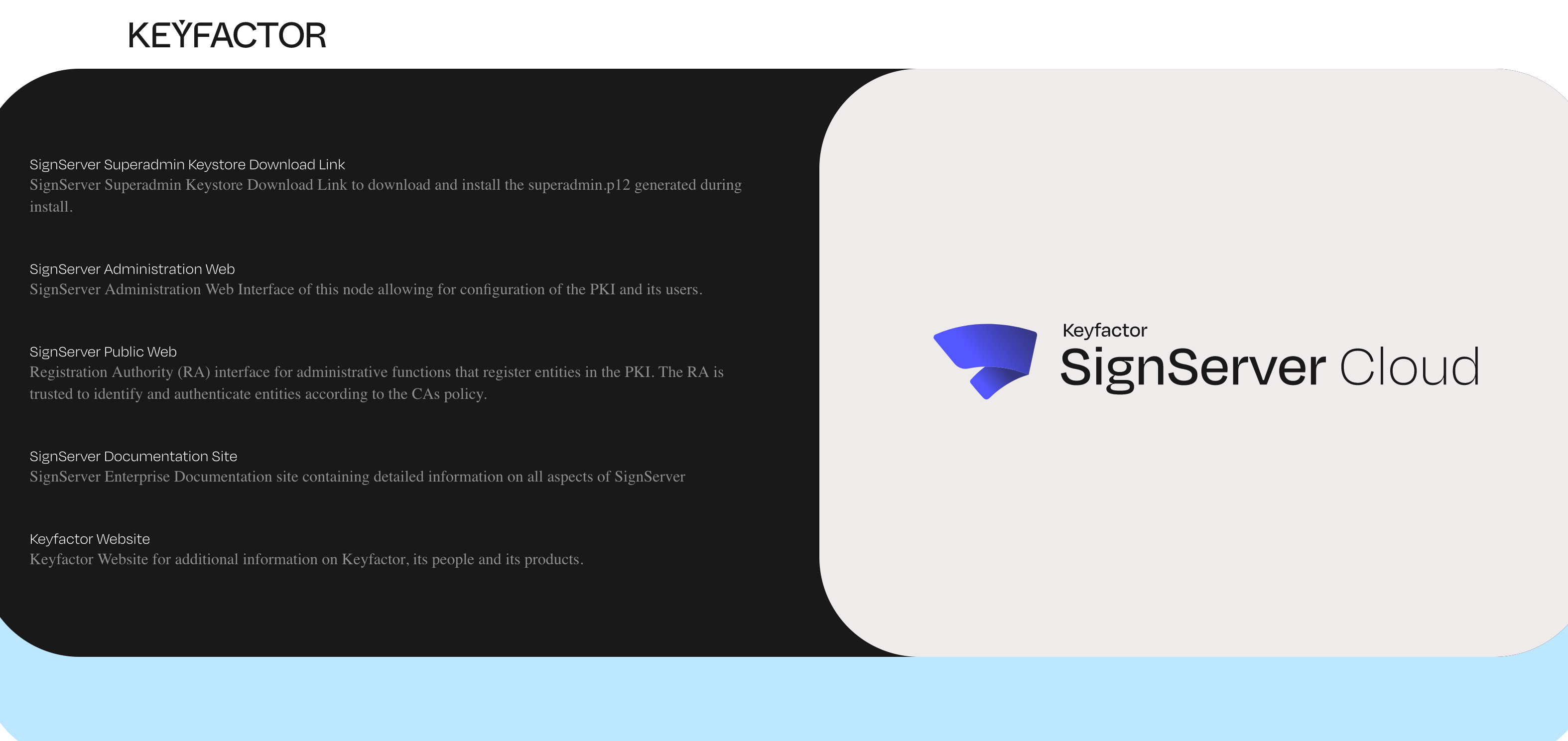 - The username is "superadmin" and the password is the password that was entered into the SignServer Cloud Wizard.