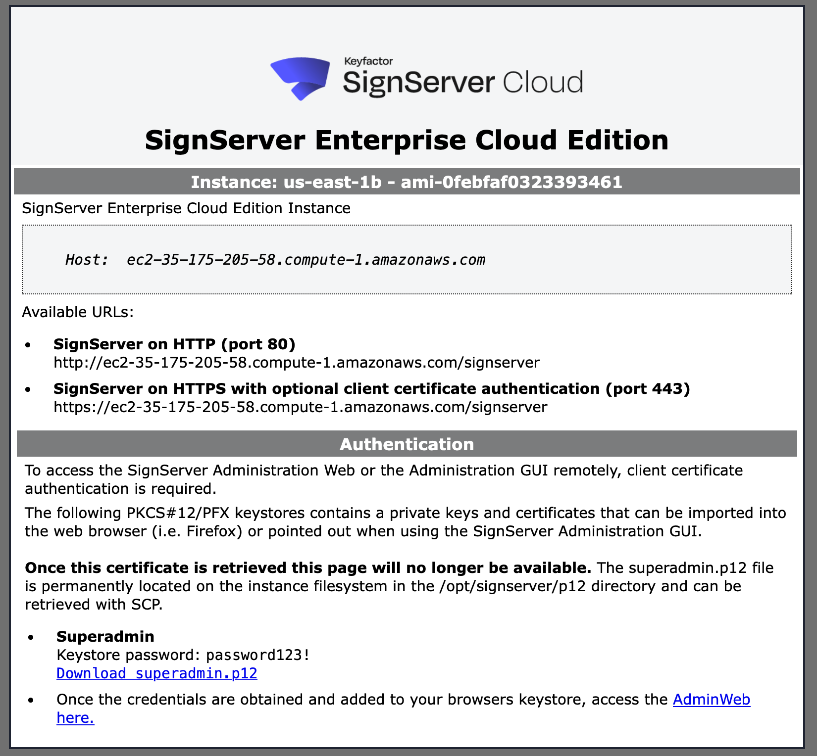 The landing page of the SignServer Cloud Instance will be accessible until the SuperAdmin keystore is downloaded from the instance. To get the superadmin.p12 file from your instance do the following: