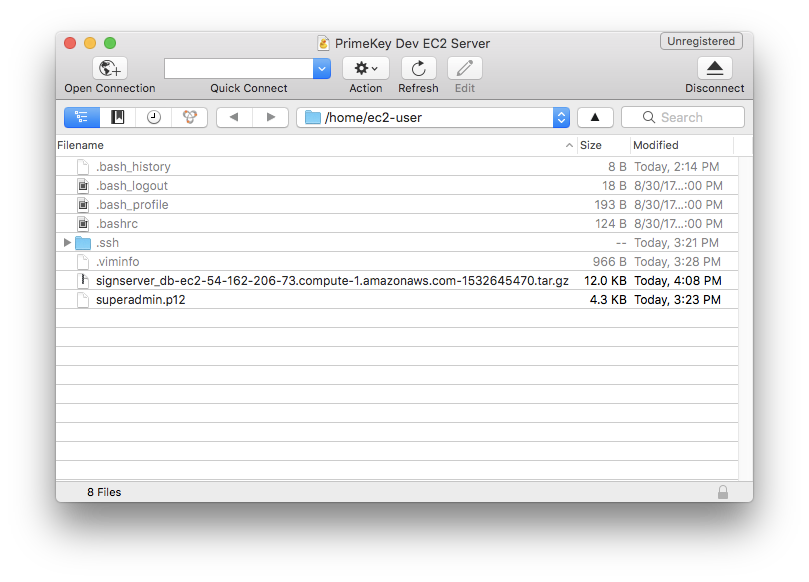 If using the CLI, the command will be a bit different since you are copying local to remote.CODE# scp -i ~/Documents/C2\ Comp/PrimeKey/EC2\ Creds/c2-ssh/c2-ssh.pem ~/Downloads/signserver_db-ip-172-16-0-128.ec2.internal-1509663778.tar.gz ec2-user@ec2-52-23-217-245.compute-1.amazonaws.com:/home/ec2-user/Once copied, SSH into the new host.