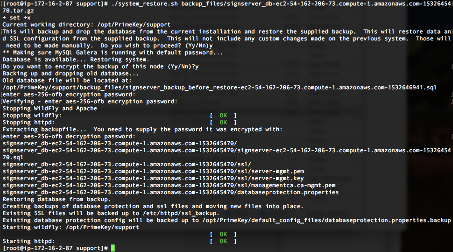 system_restore.shby pointing it to the backup file location after the script. In this example, the backup file is located in/home/ec2-user/and the file name issignserver_db-ip-172-16-0-128.ec2.internal-1509663778.tar.gz.CODE# /opt/PrimeKey/support/system_restore.sh /home/ec2_user/signserver_db-ip-172-16-0-128.ec2.internal-1509663778.tar.gzConfirm the script and then enter the password for your backup once prompted.