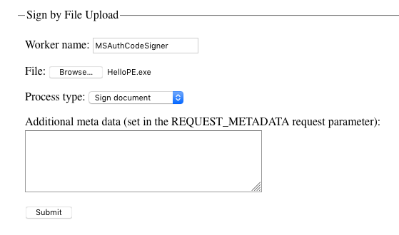 The following describes how to submit and sign an executable file with the MS Authenticode signer either using the SignServer Demo Web or the SignServer Client CLI SignClient.