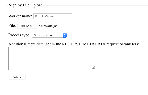 The following describes how to submit and sign a JAR with the JArchive signer either using the SignServer Demo Web or the SignServer Client CLI SignClient.