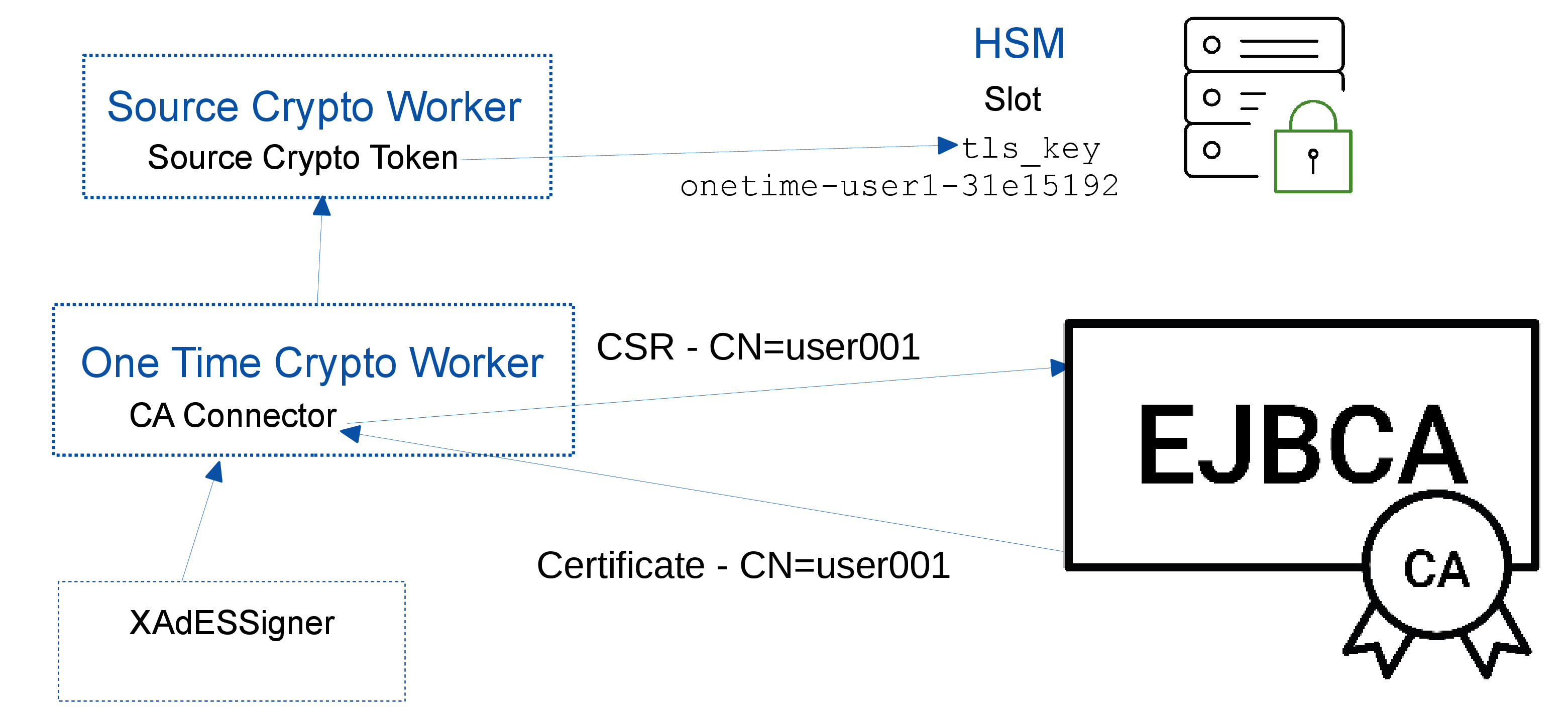 The XAdeSSigner references the One Time Crypto Worker in order to perform a signing operation. The signer is configured with a Username Authorizer to provide the user data used by the CA for certificate issuance.