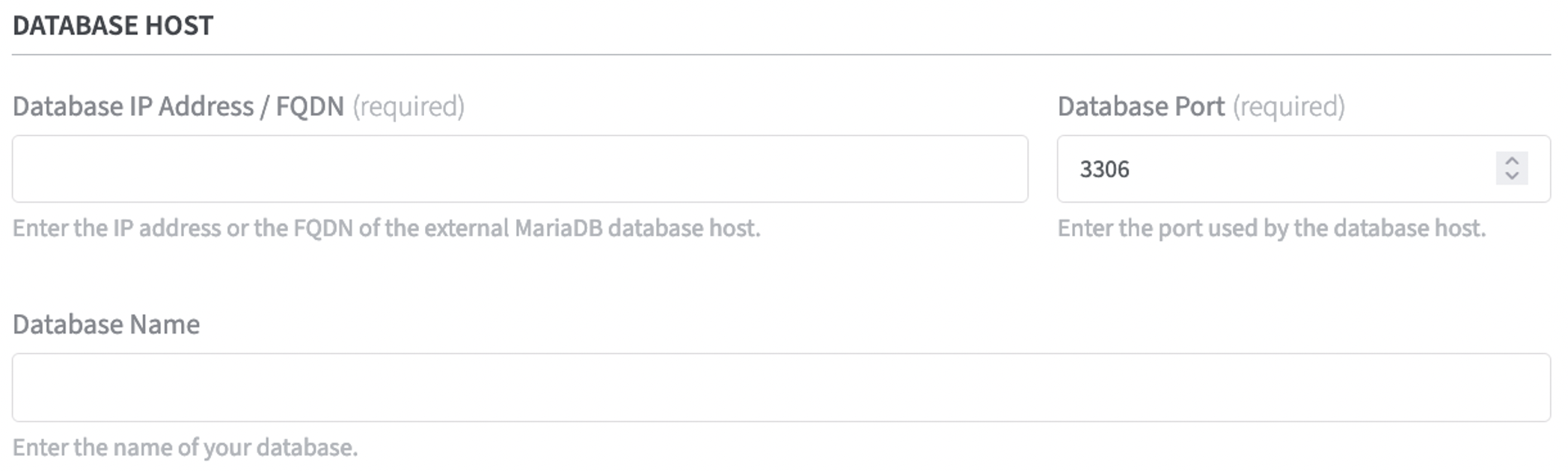 - Database IP Address / FQDN (required): Enter the IP address or the FQDN (Fully Qualified Domain Name) of the external MariaDB database.