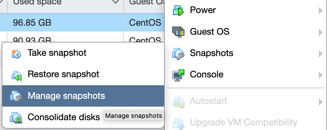 Click Actions in the top menu bar to open the menu. - Click Snapshots to open the sub menu.