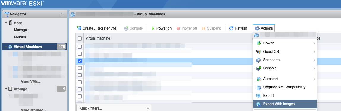 ESXi offers import and export functions to back up a virtual machine to disk (.ovf, .vmdk), or to restore from it.