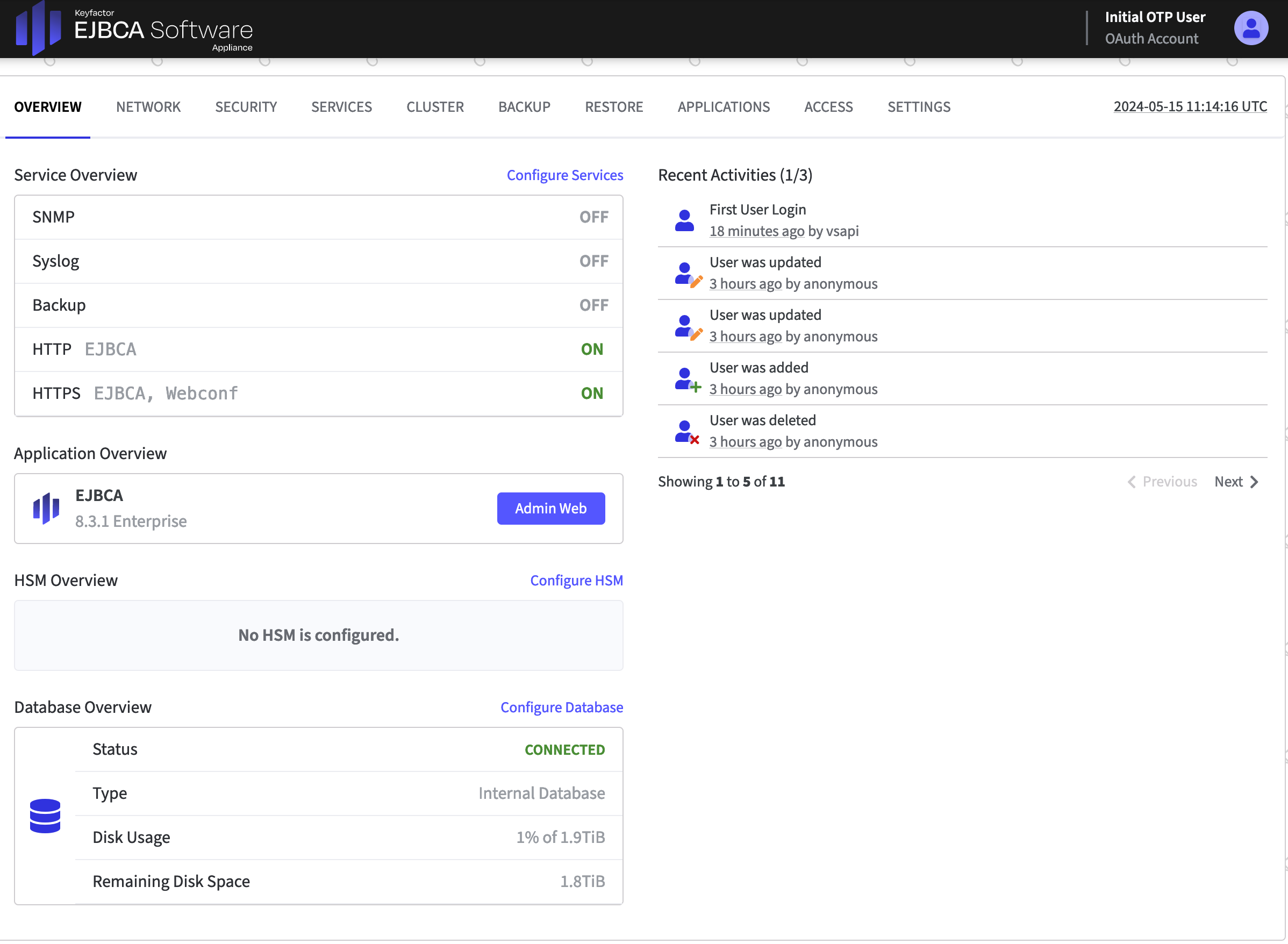 When you log in to the Software Appliance, it opens with the Overview page. Use this page and the menu bar to access all operations available for the Software Appliance.