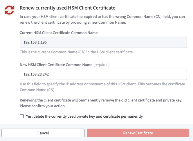 If your HSM client certificate has expired or the Common Name (CN) field is incorrect, you can also renew the certificate.