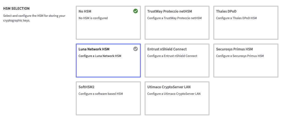 Configuring an HSM for the Software Appliance is irrevocable. To change an HSM configuration, you must reset the Software Appliance.