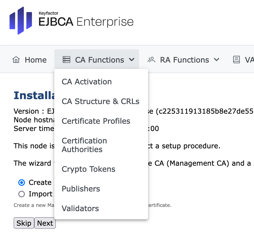 Check whether the Create new CA checkbox is selected. - Open the CA Functions drop-down menu in the top menu.