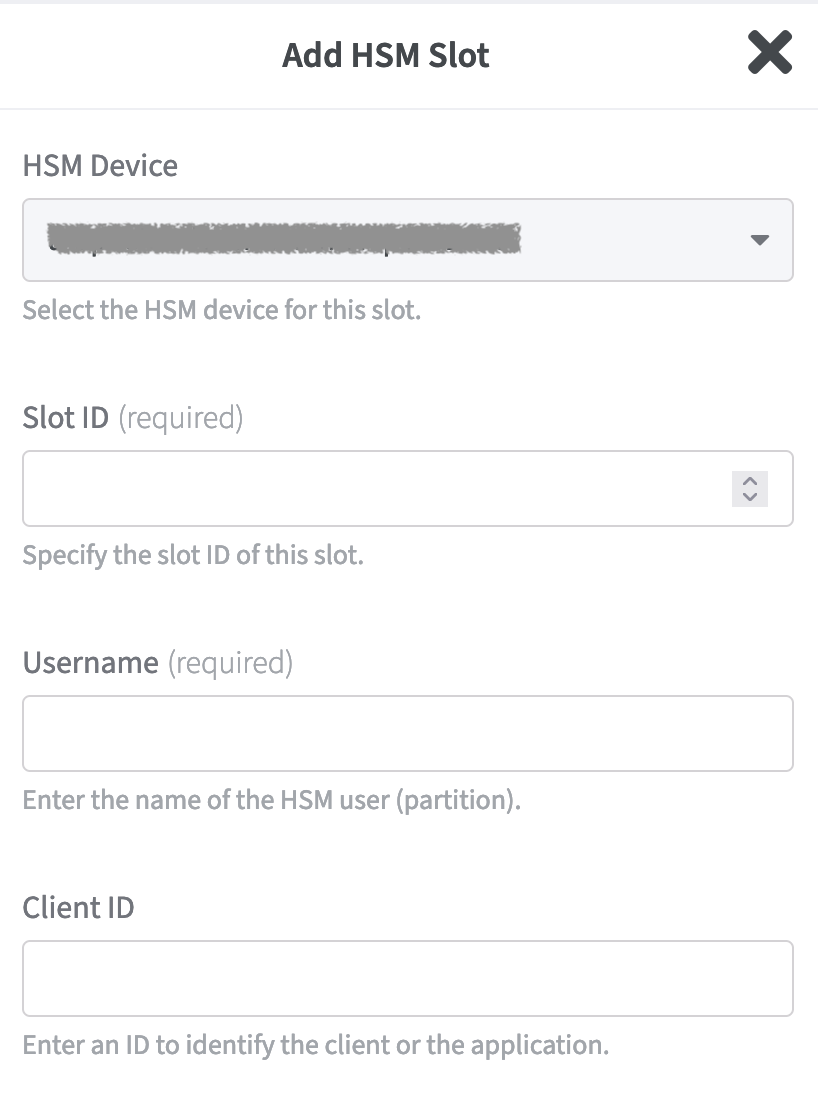 - At the first line: HSM Device, select the HSM for which the slot is to be defined. If several HSM Devices are configured, you can open the corresponding list using the drop-down menu.