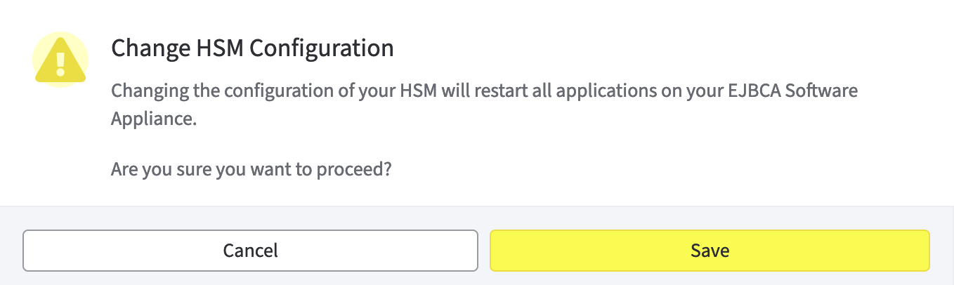 A warning appears to inform you that changing the configuration of your HSM will restart all applications on your EJBCA Software Appliance.