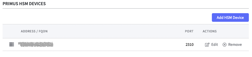 The device will now be listed in the table Primus HSM Devices. Here you can now preform actions such as Edit Device or Remove Device.