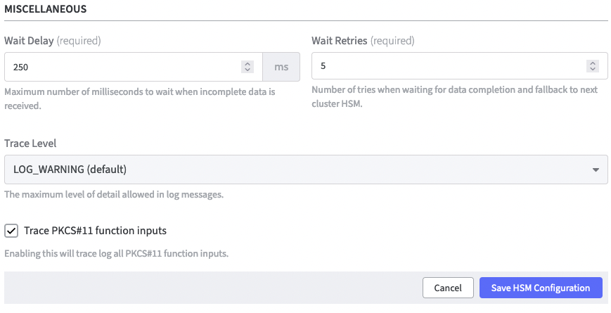 The individual sections are: Wait Delay, Wait Retries, Trace Level or set the Trace PKCS#11 function inputs.