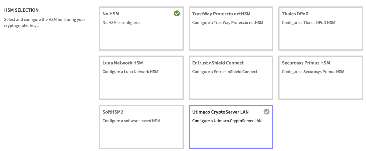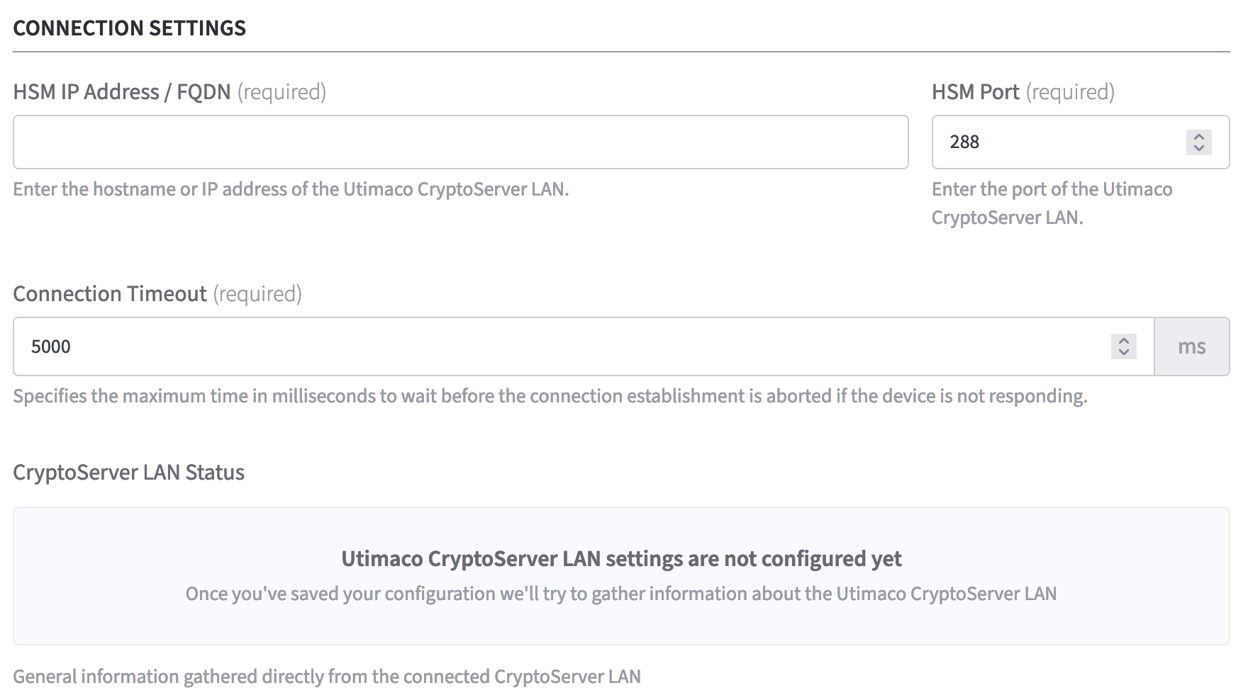 In the HSM Configuration section, select Utimaco CryptoServer LAN to access the Configuration fields.