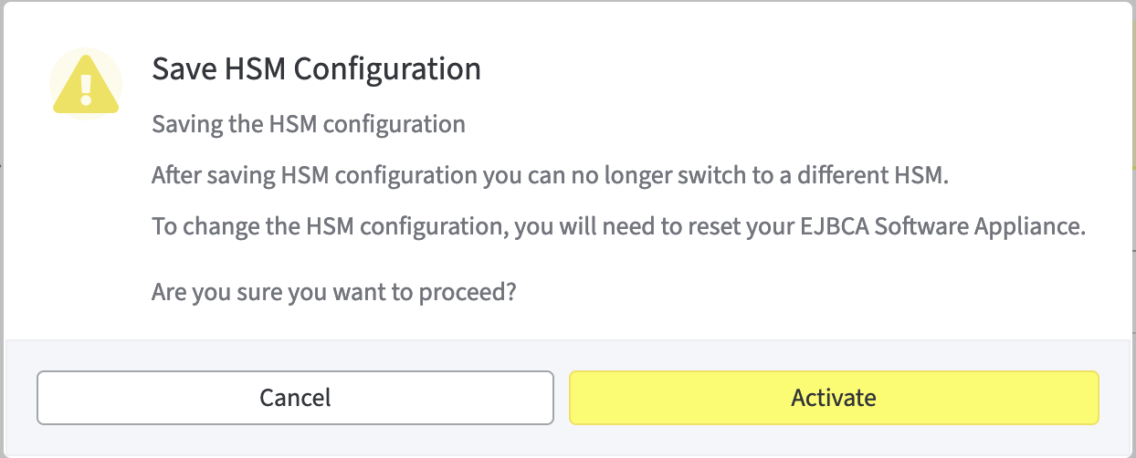 To change the HSM configuration, you need to reset your EJBCA Software Appliance. Proceed by clicking Activate.