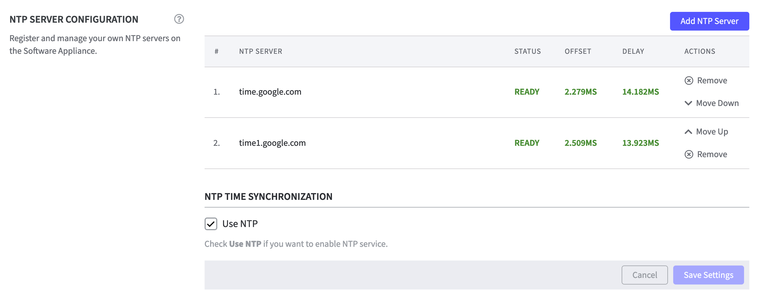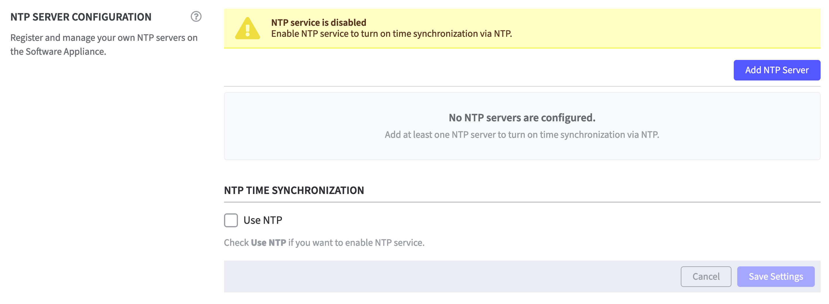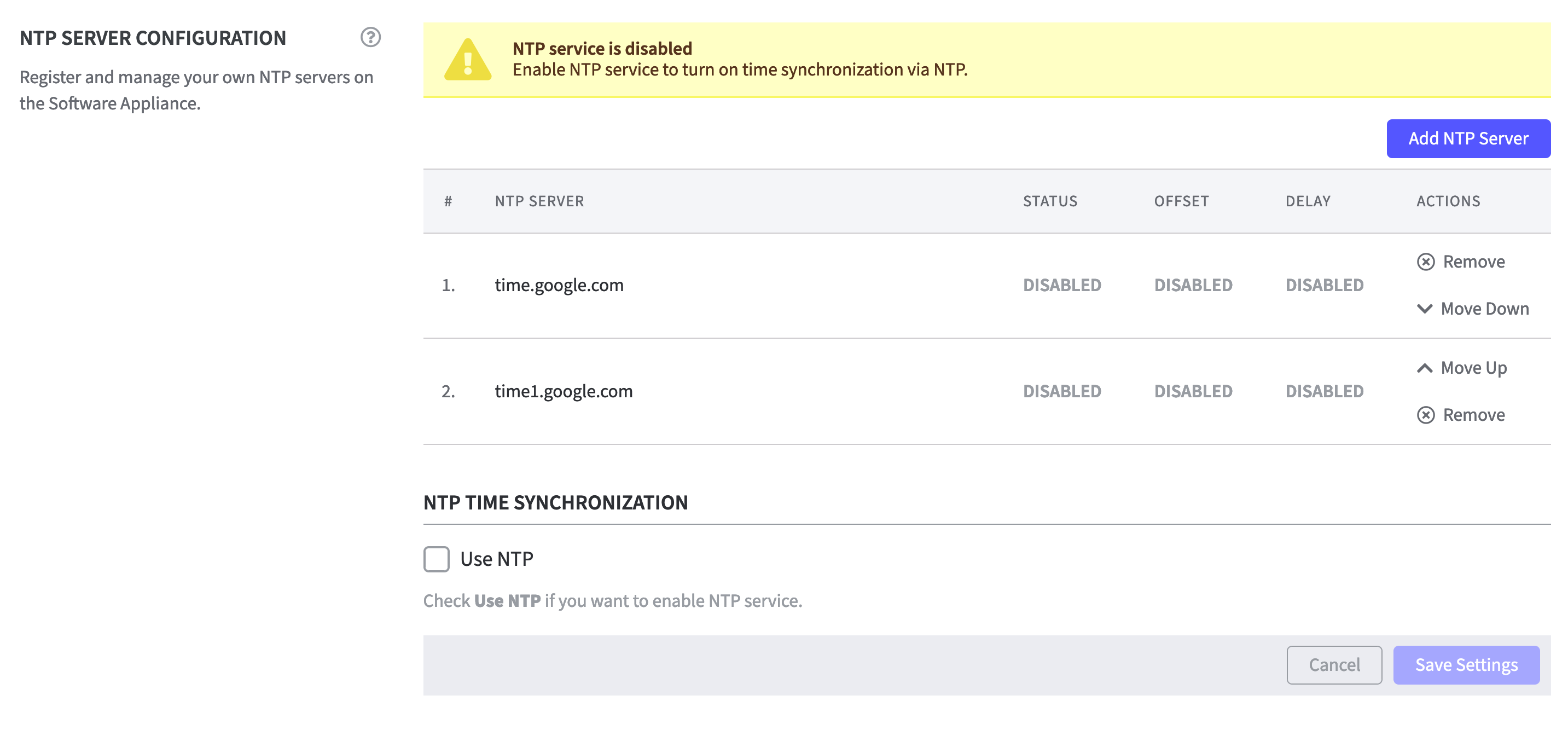 To use NTP Time Synchronization it is possible to register and manage NTP (Network Time Protocol) Server(s) on the Software Appliance. The first step is to configure NTP Server(s), which can then be activated for NTP Time Synchronization.