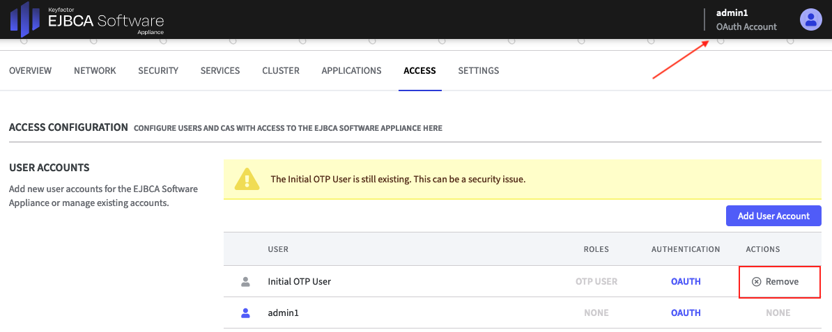 After the new User Account is added, log in again with the new User Account. Now you can delete the Initial OTP User.